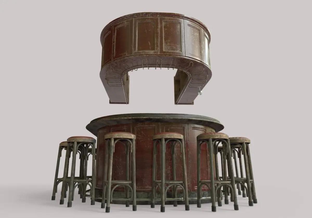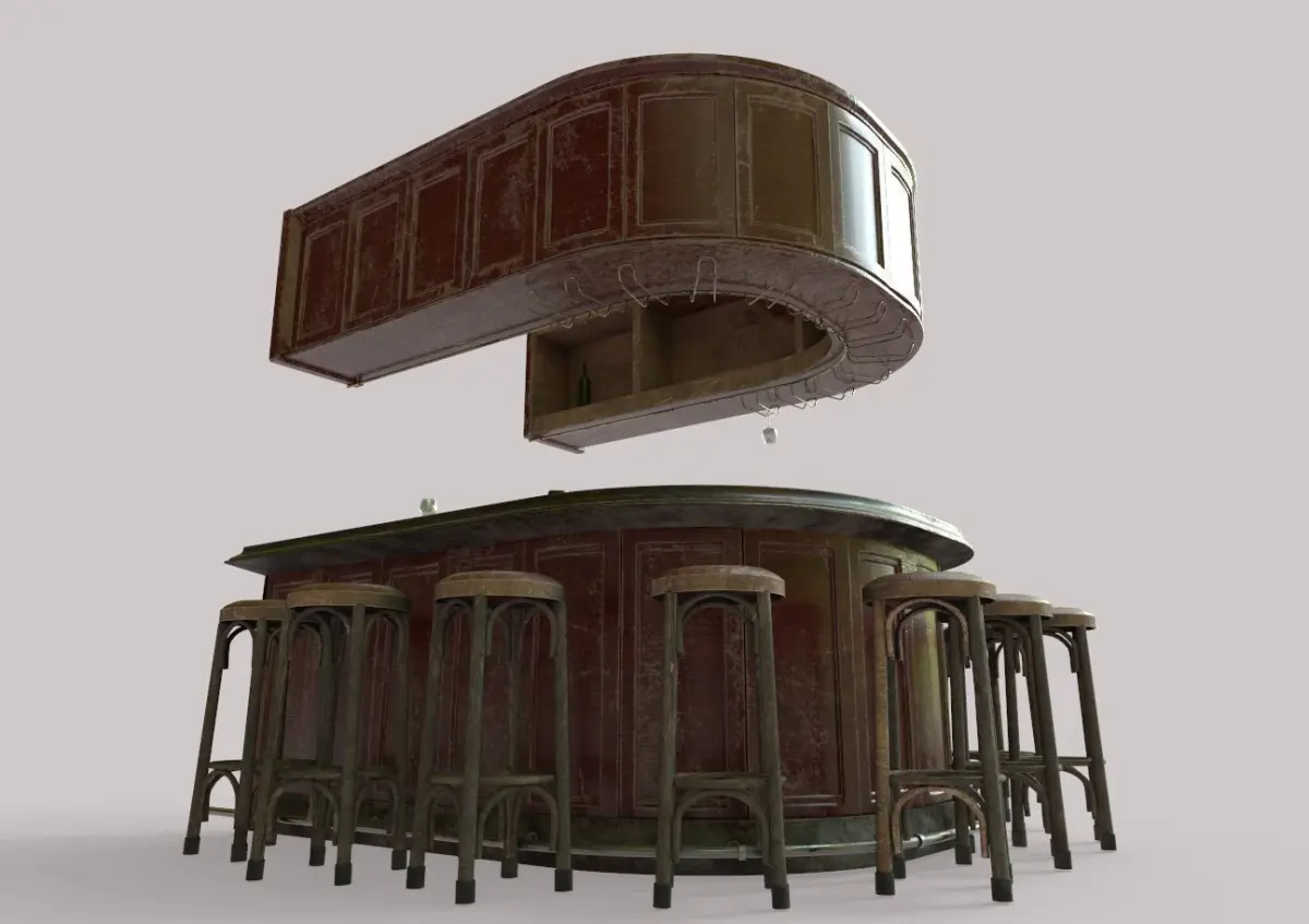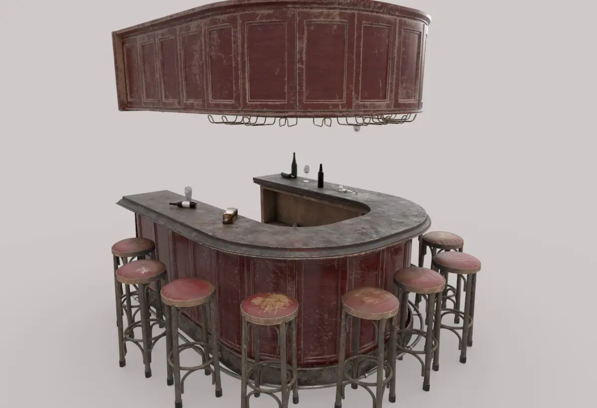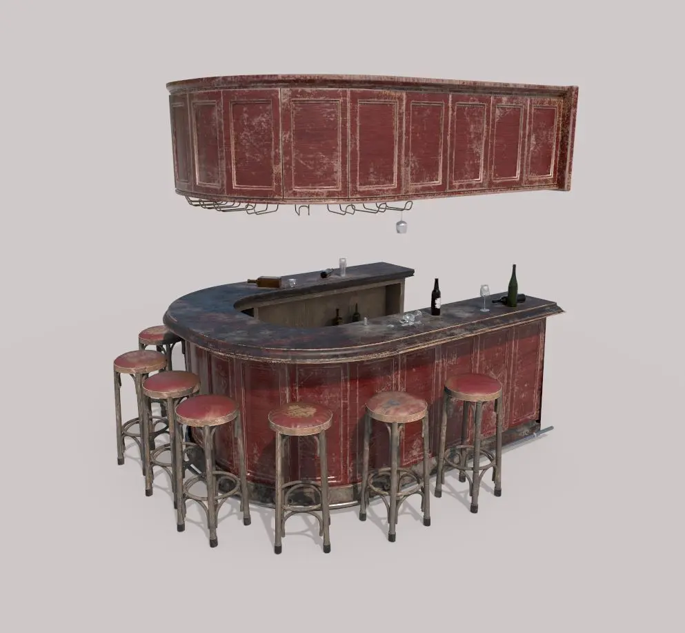Model of old bar . Model is very realistic.It has 7 PBR material.Maps are diffuse-specular-glossiness-height and normal. Also, PBR Metallic-Roughness ( Basecolor- Metallic- Normal-Roughness- Height and Opacity ) workflow has been added. Model's textures has two sizes; 4096x4096-2048x2048. All maps are PNG formats .A non-glass version of the model has also been added.