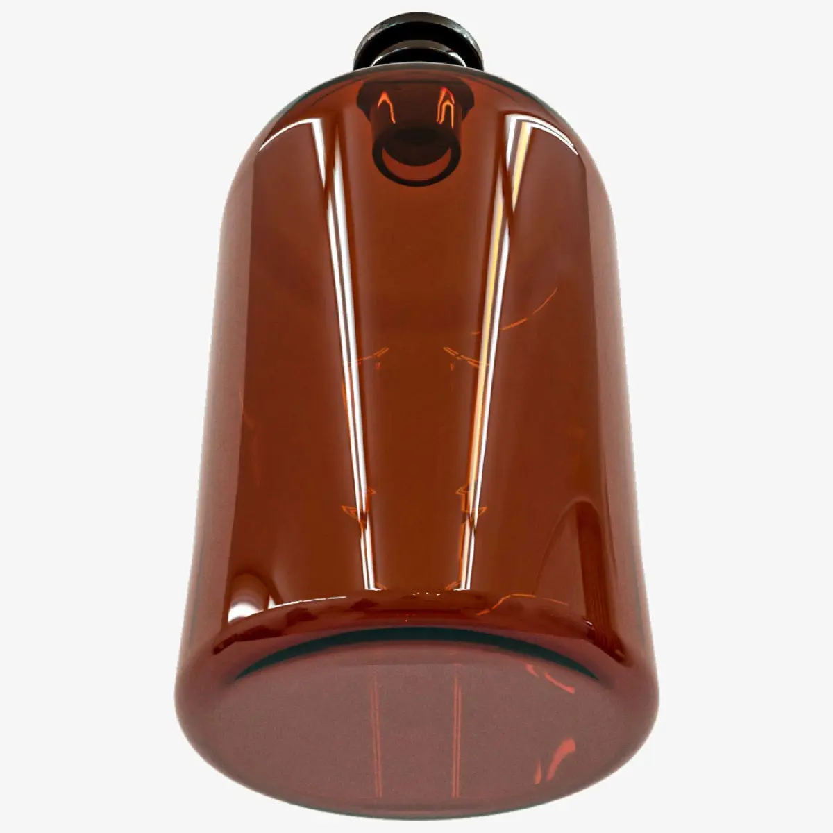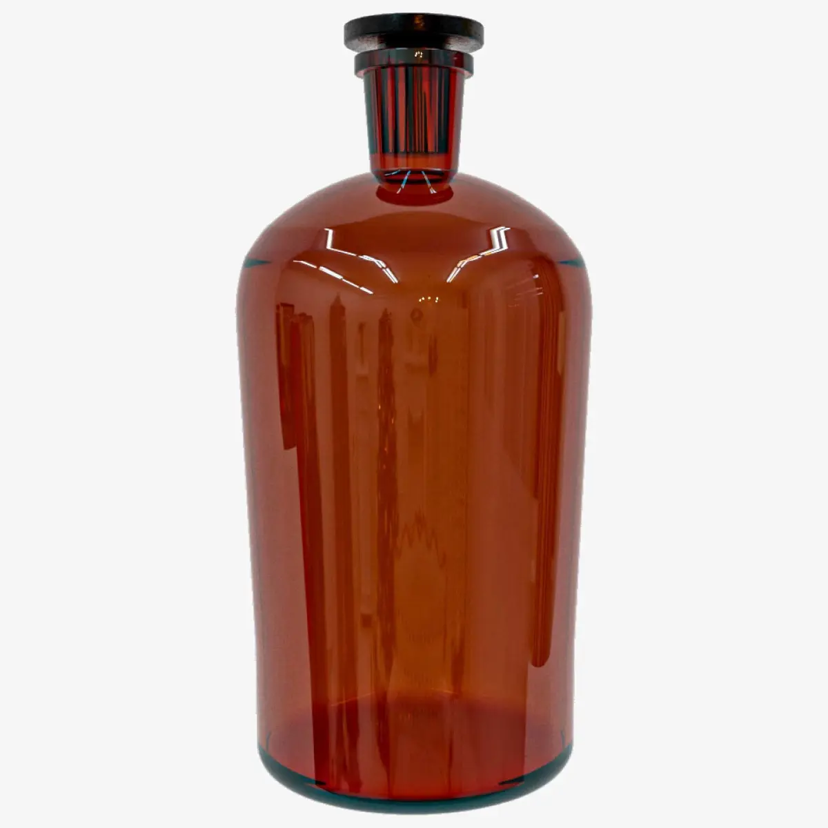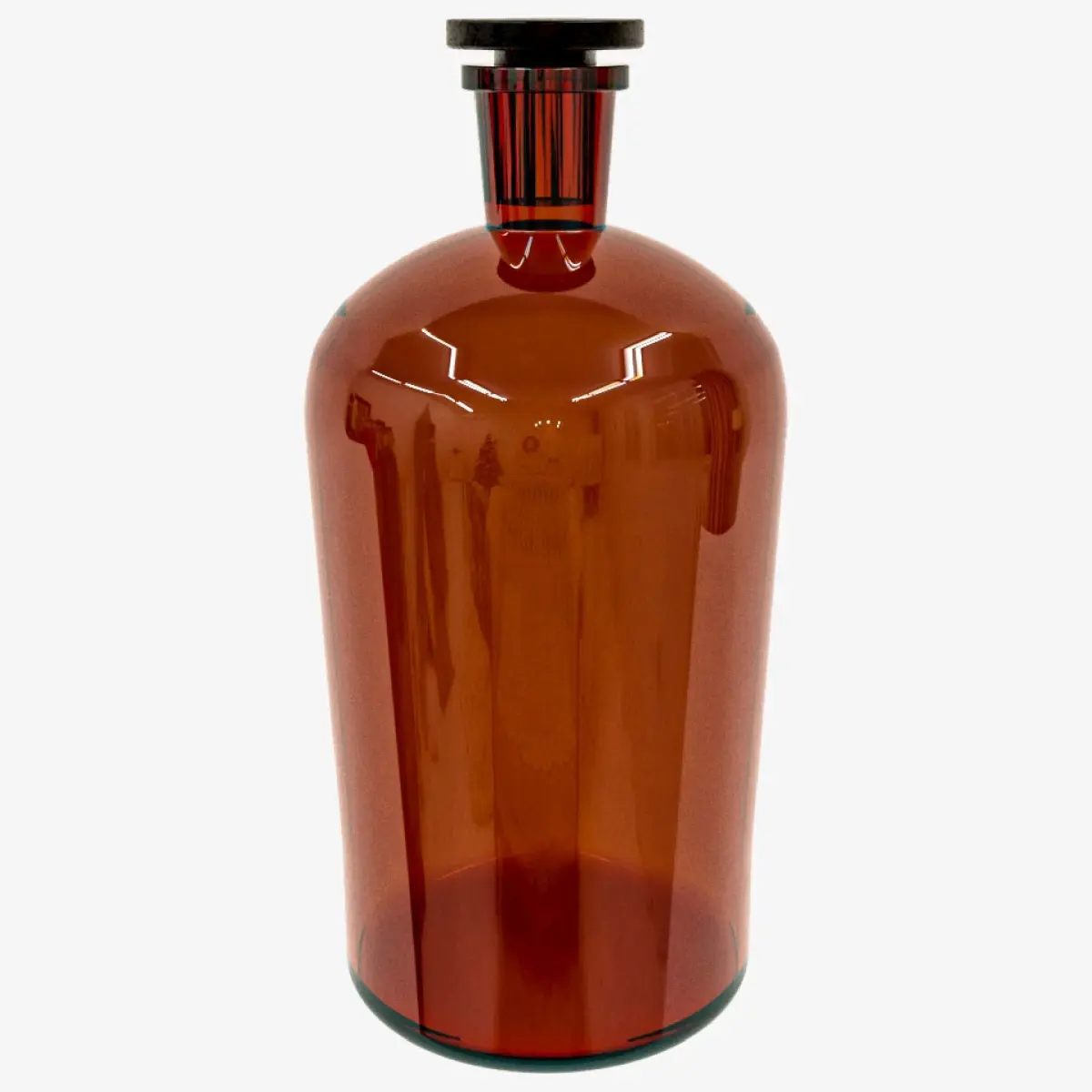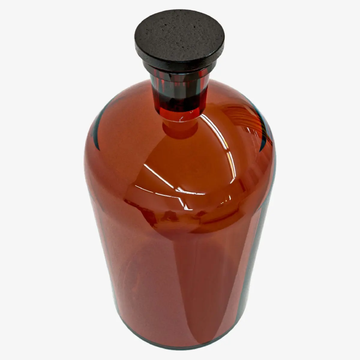 Amber glass bottle with a cylindrical design and a slightly rounded base. It has a short neck that connects to a stopper. Its finish is shiny, reflecting the surrounding lights.The style of the bottle evokes a classic or utilitarian design, related to the storage of liquids such as chemicals, medicines, or liquors.