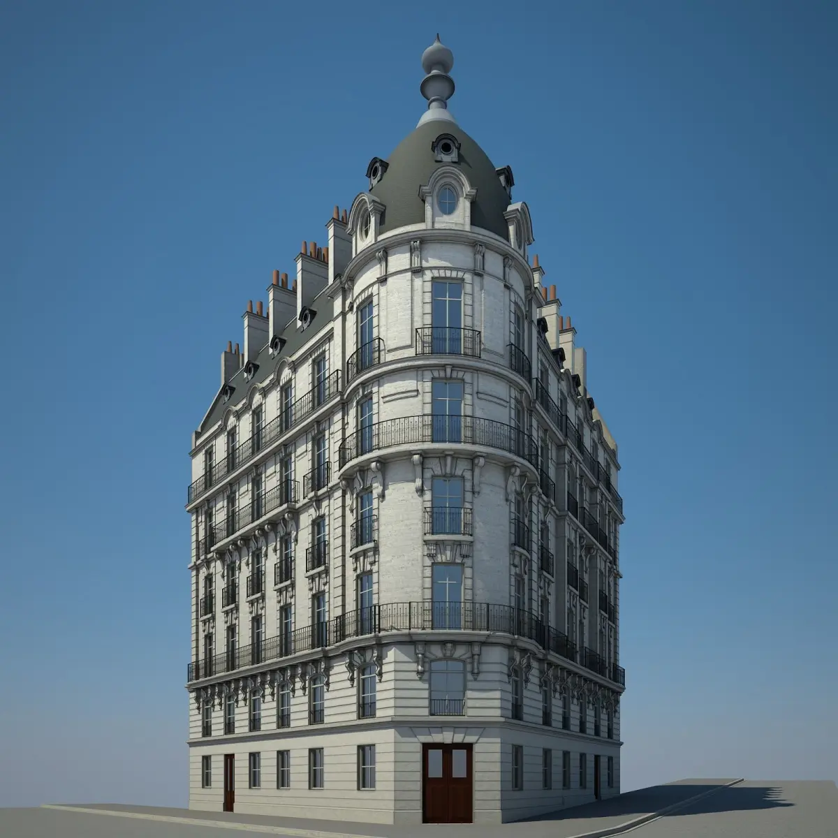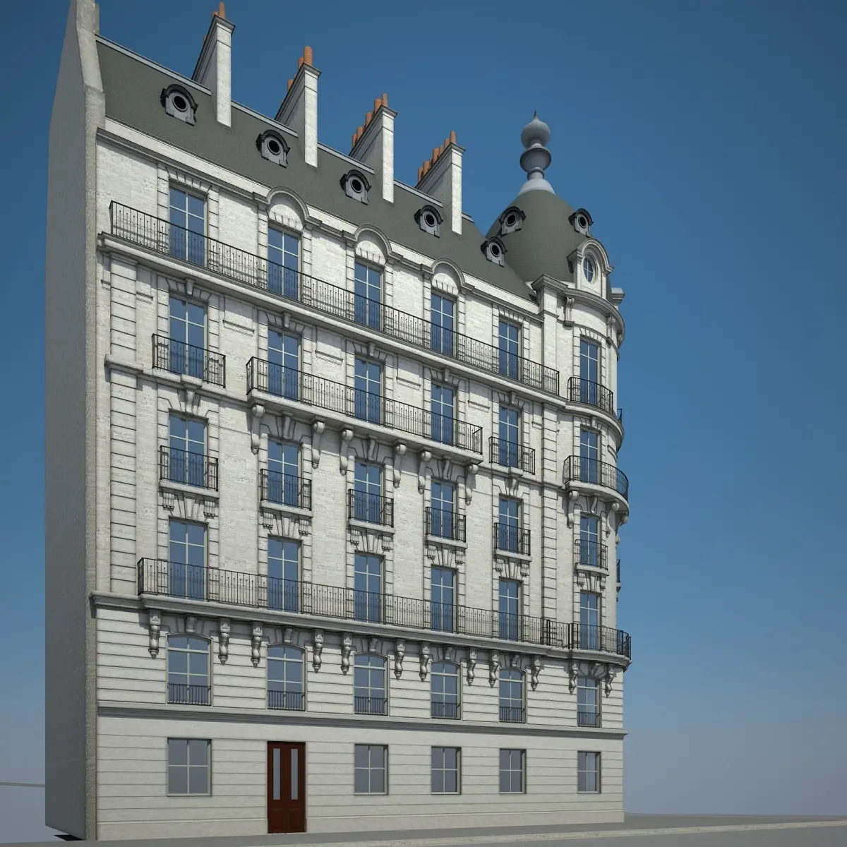 Detailed 3D model of an urban historical building.The two larger building facades make a 60 degree angle.