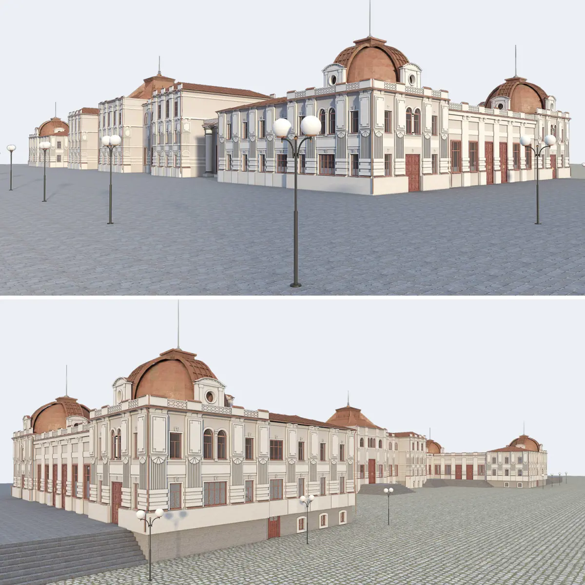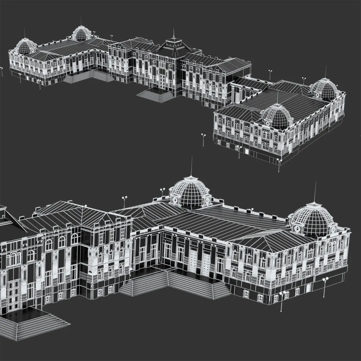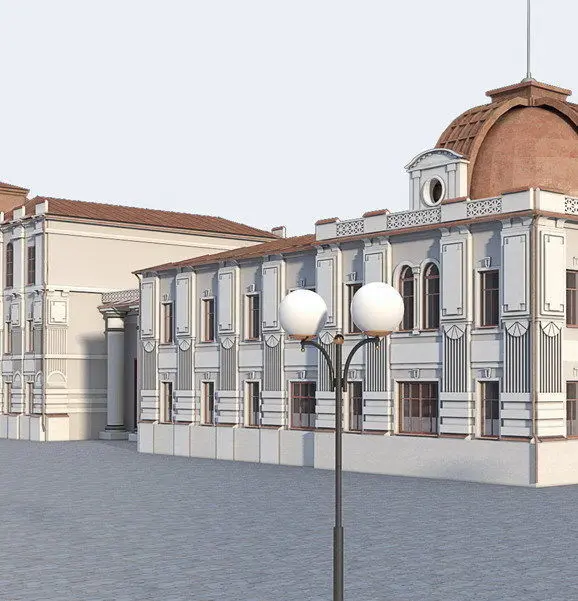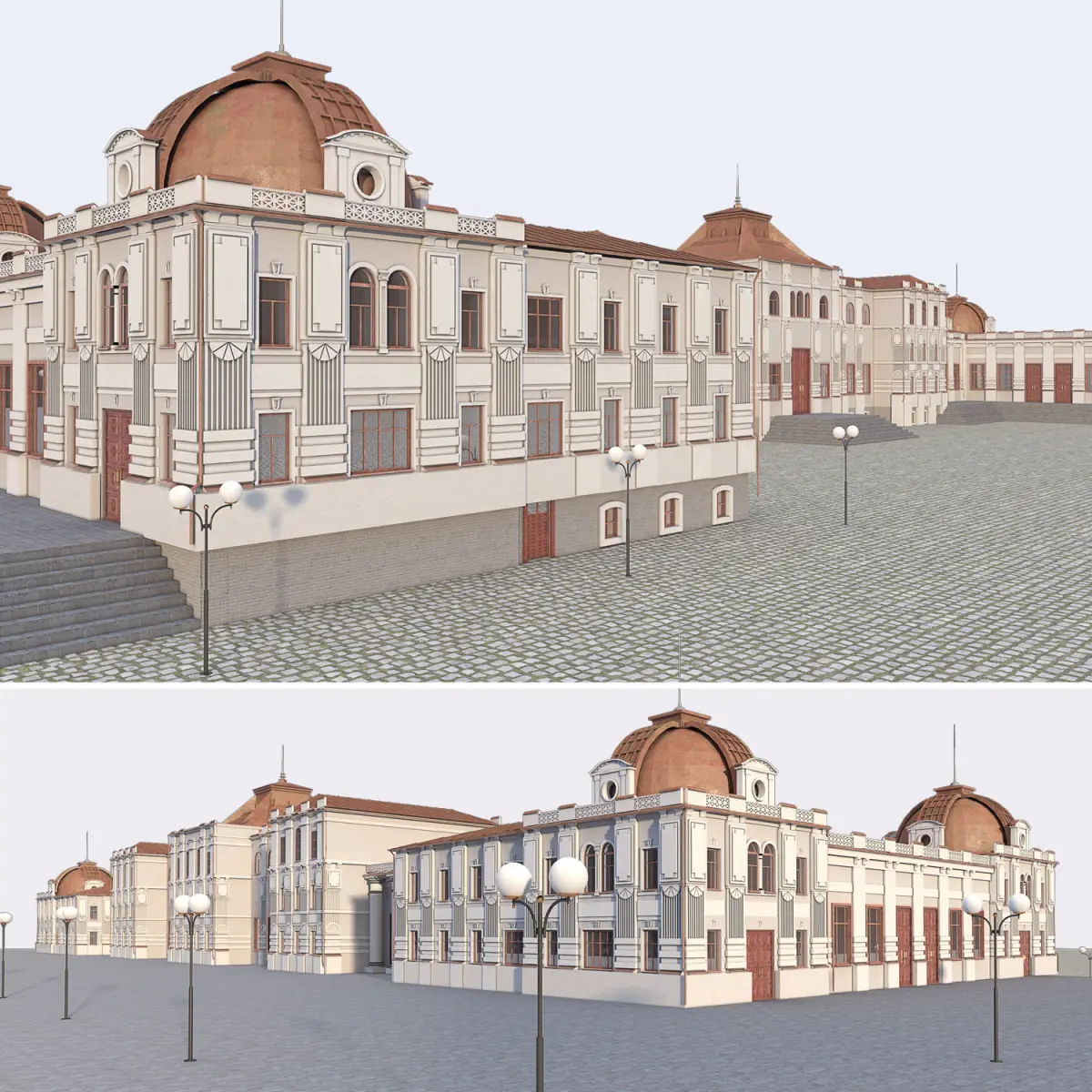The building organically fits into the architecture of the city and can act as various meanings, be it a museum, a railway station, an educational institution, a military hospital, an office building, a library, etc. This structure will enrich your project with a beautiful classic exterior. Good renders to you. Everything you see on the preview is present in the file, including lampposts and paving stones.