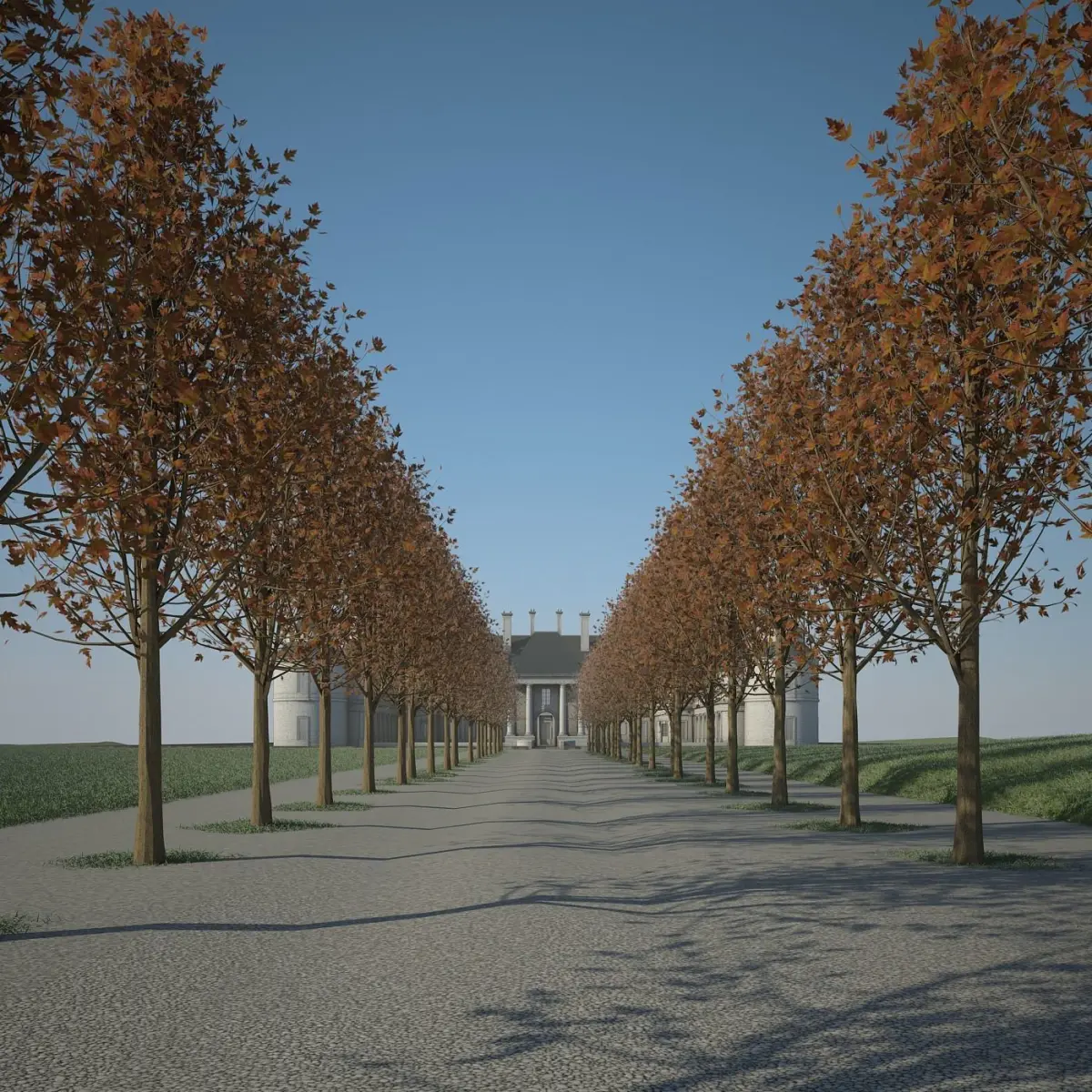 Trees are VRayProxy. Effects include VRayEnvironmentFog and VRayDirt.