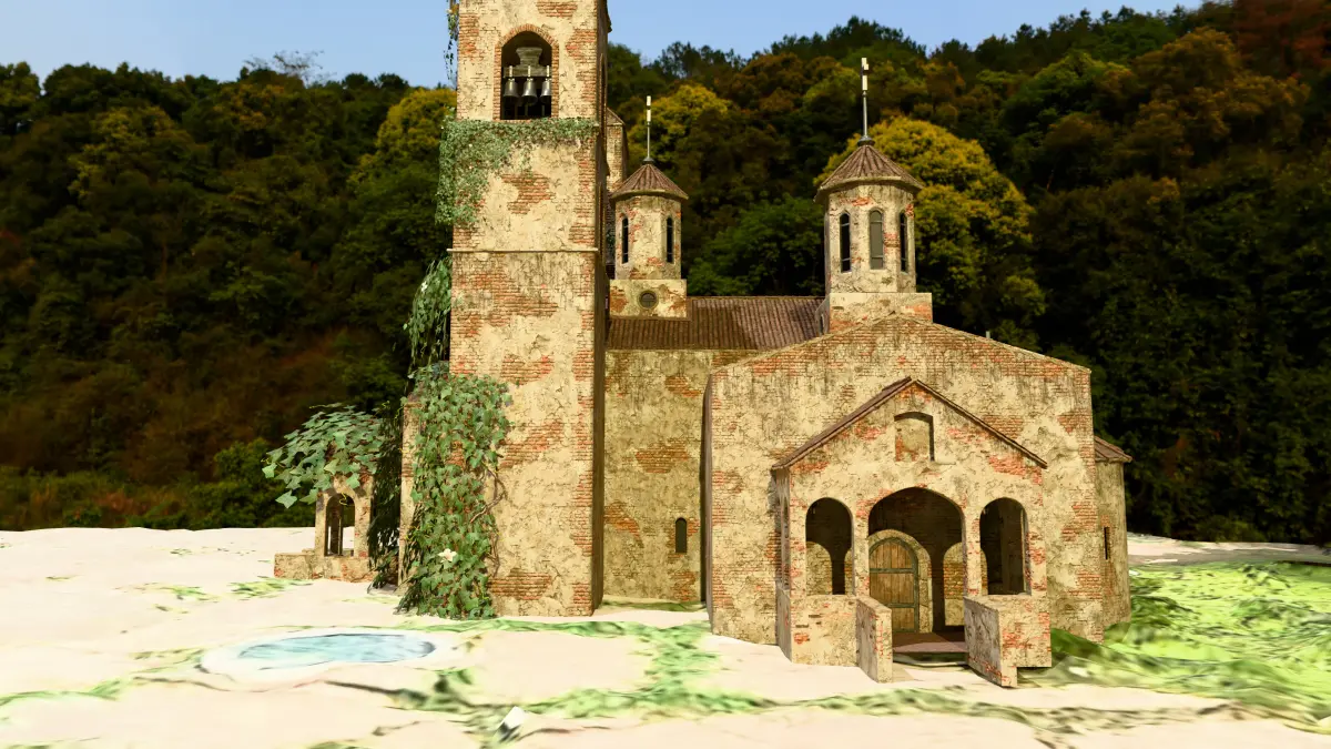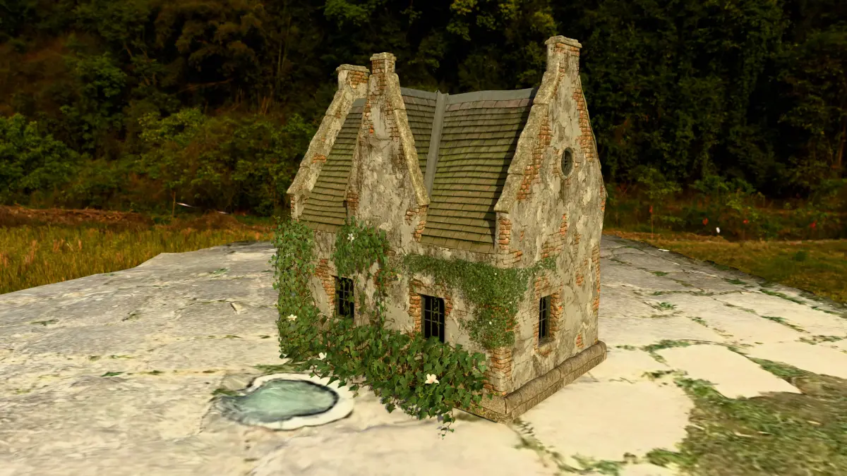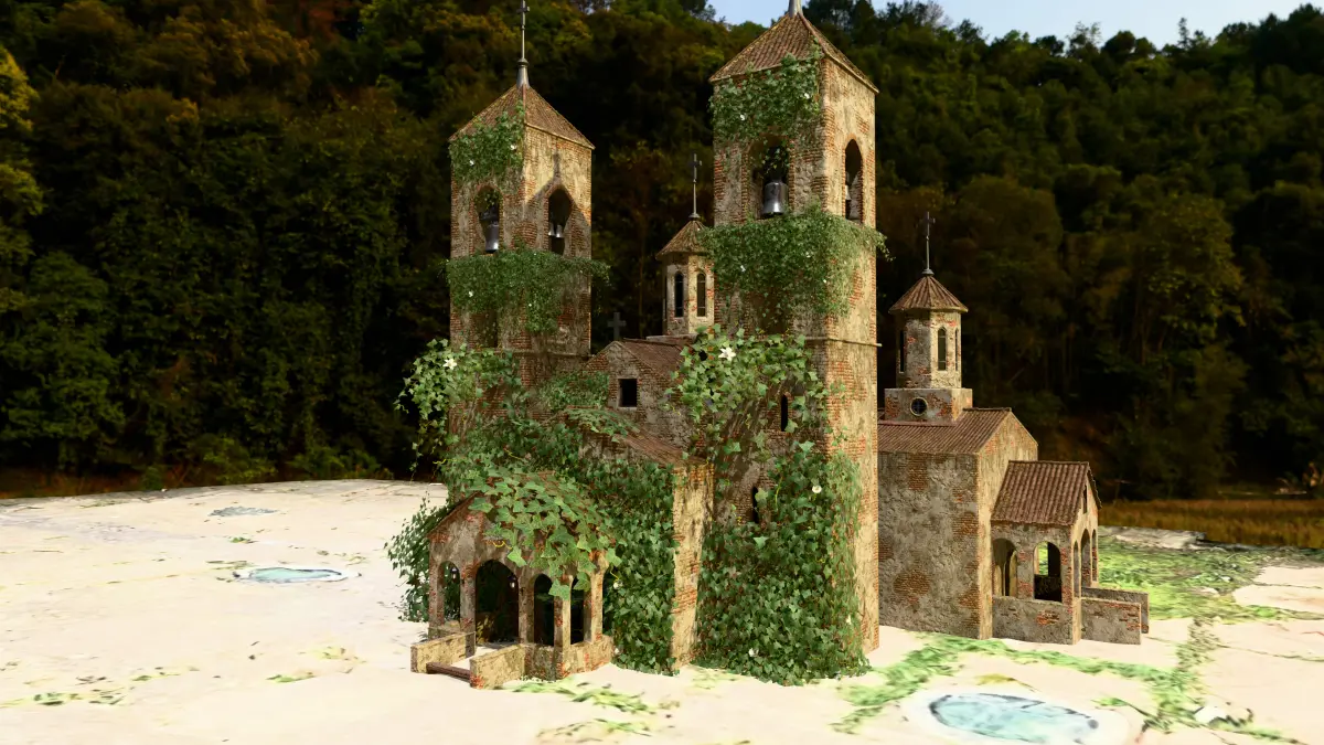 This environment pack includes a highly detailed old European-style church with two ivy-covered abandoned houses and a leafy forest ground. The entire scene is designed with realistic textures and natural overgrowth for use in games, animations, and cinematic projects.