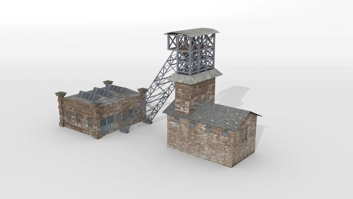 Some old brick style coal mine buildings, typical for the former site in the industrial heart of Germany, the Ruhr valley region. Complete with a headframe and machine hall. Textures and materials are included. Other file format is extensible 3D (x3d).