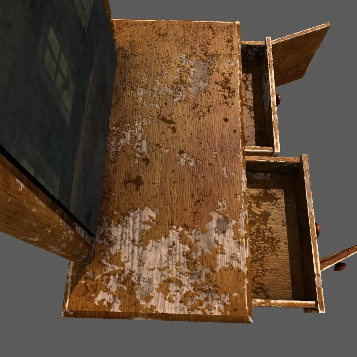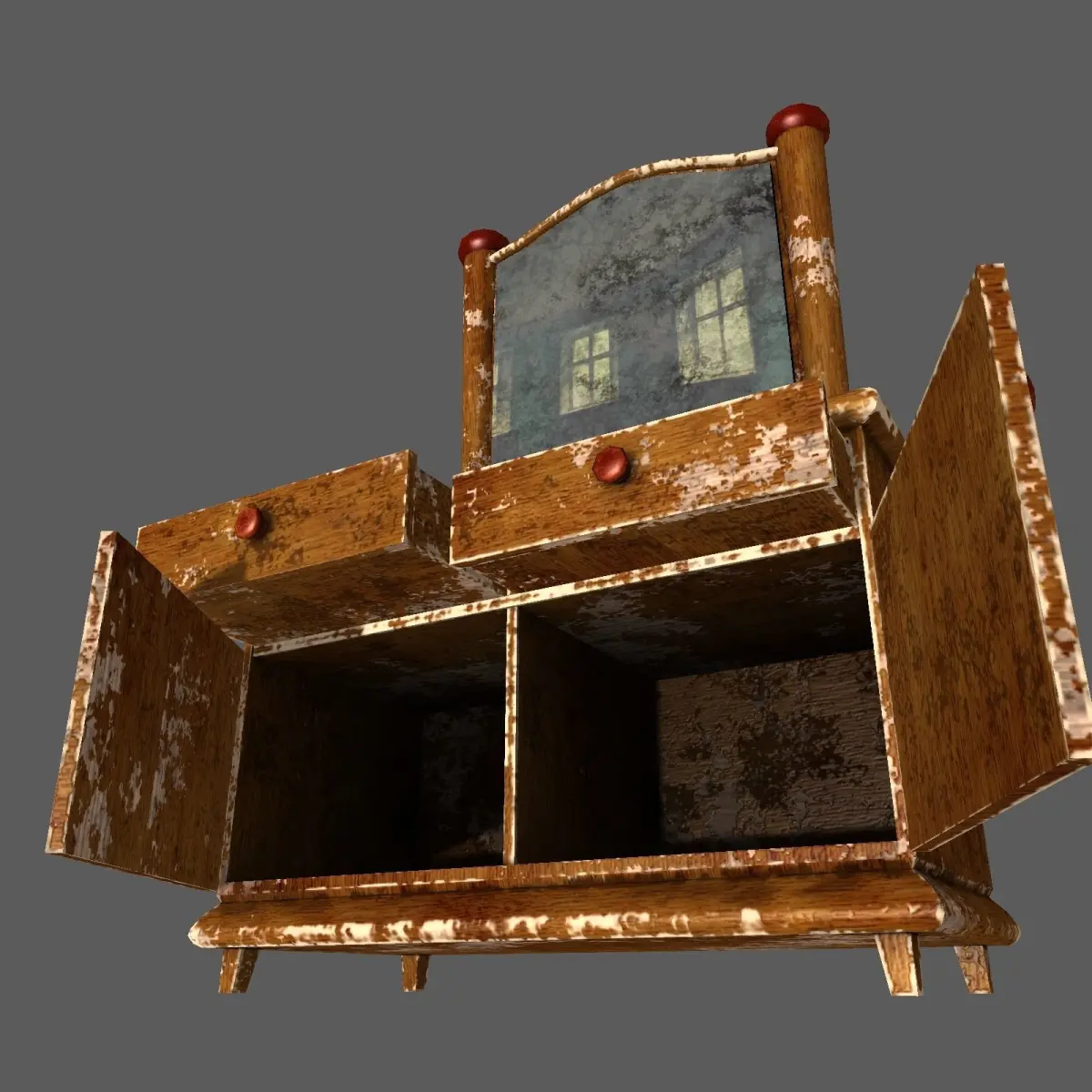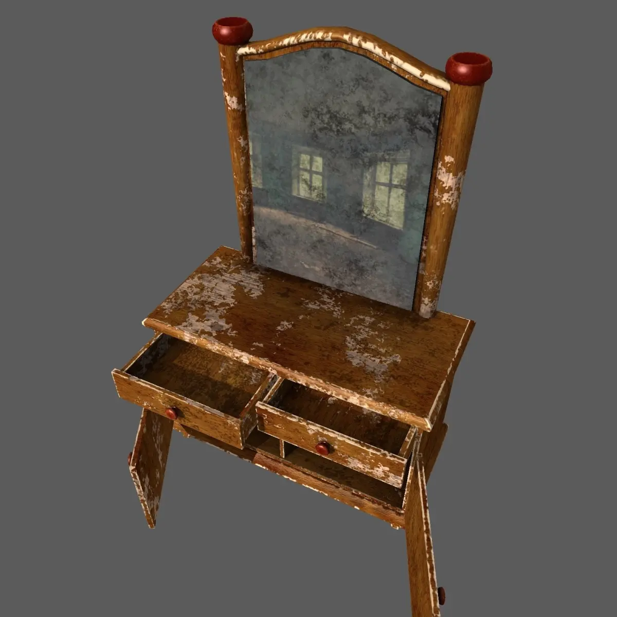 Old Dressing Table ------------------ -Ready to game engine -Low poly model -Clean-up model -2 materials: Wood--2048x2048 Mirror--1024x1024 --------- Textures: AO Color Normal Gloss Specular --------- File formats: FBX, MA --------- Poly--741 Tris--1378 Vert--838