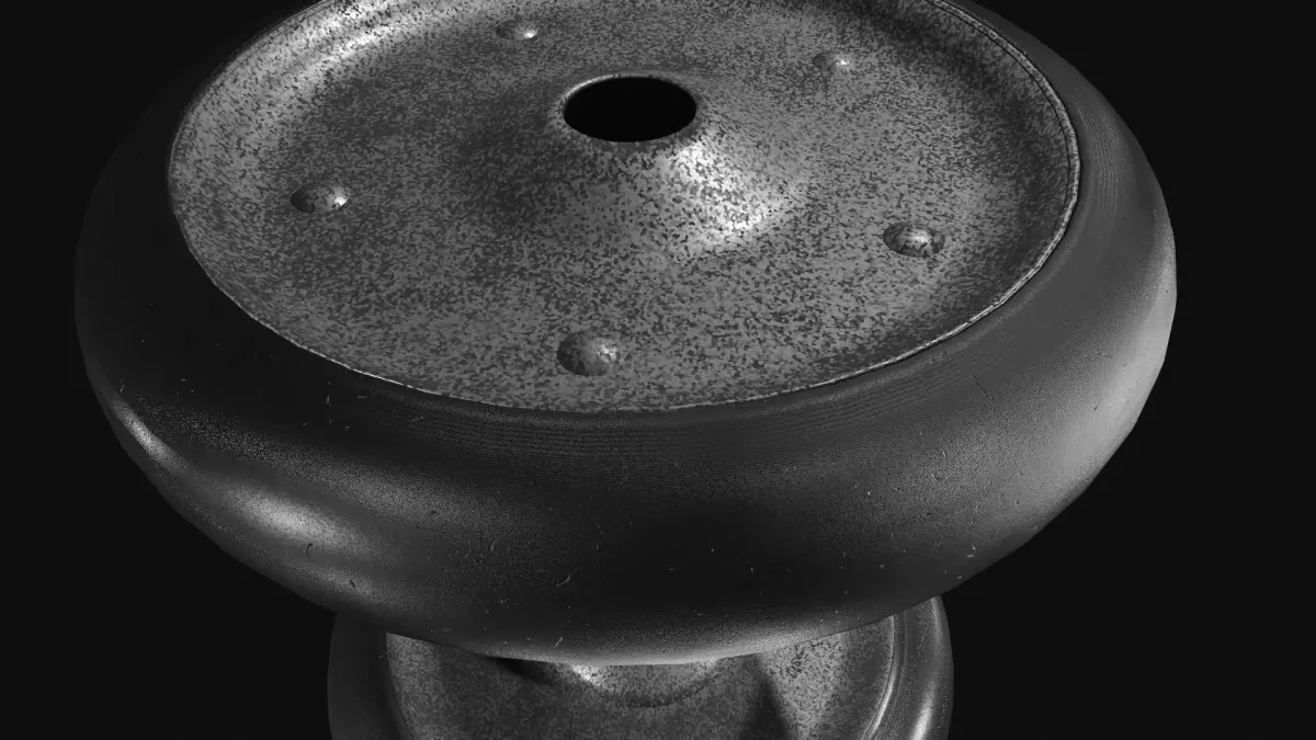 The texture of the corroded metal and worn rubber has been made in the shader editor of Blender.