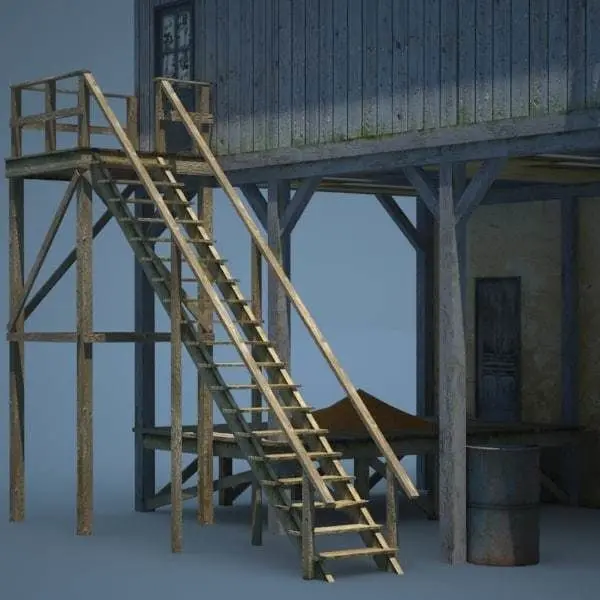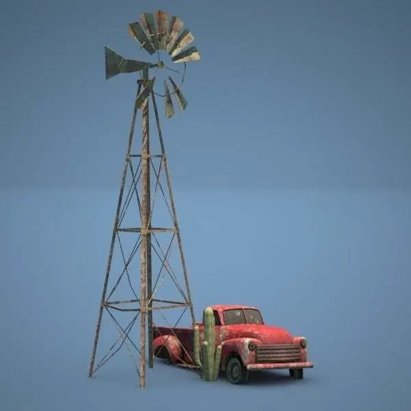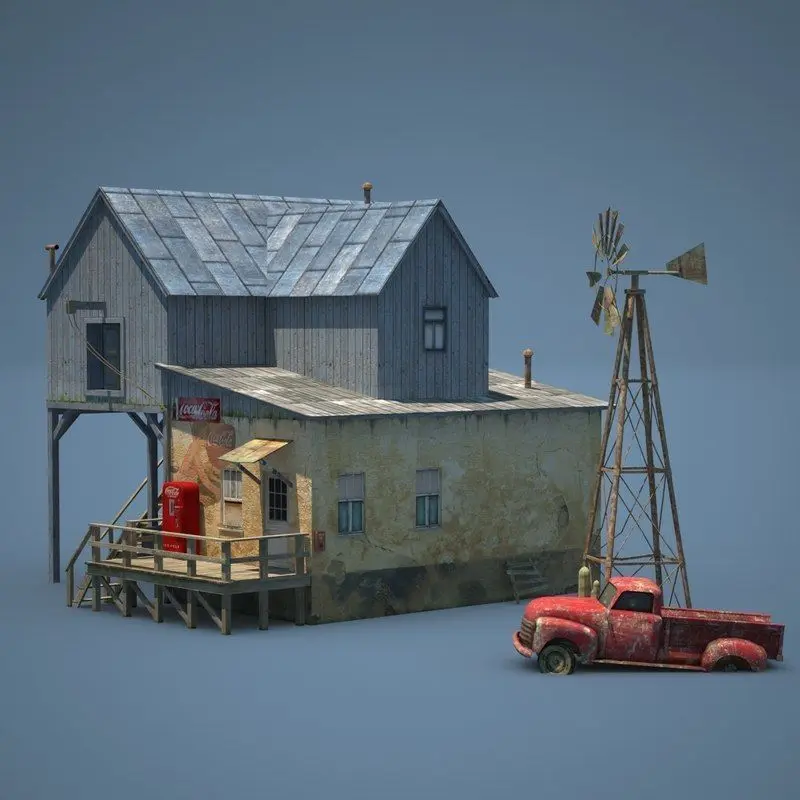 ow poly 3d model of an american farm with a shop, a wind mill and an abandoned Chevrolet car. I tried to give it an old and damaged look.