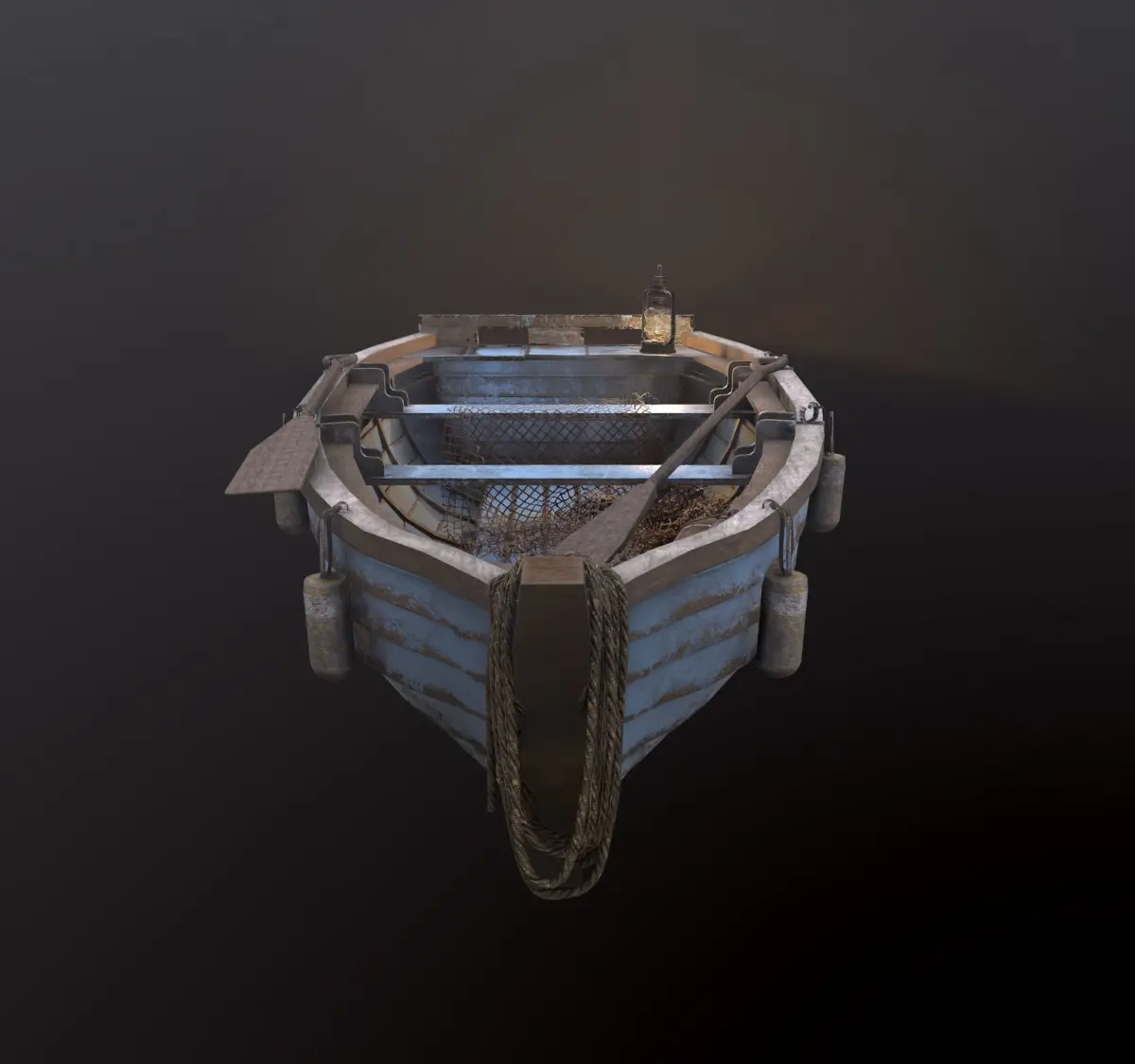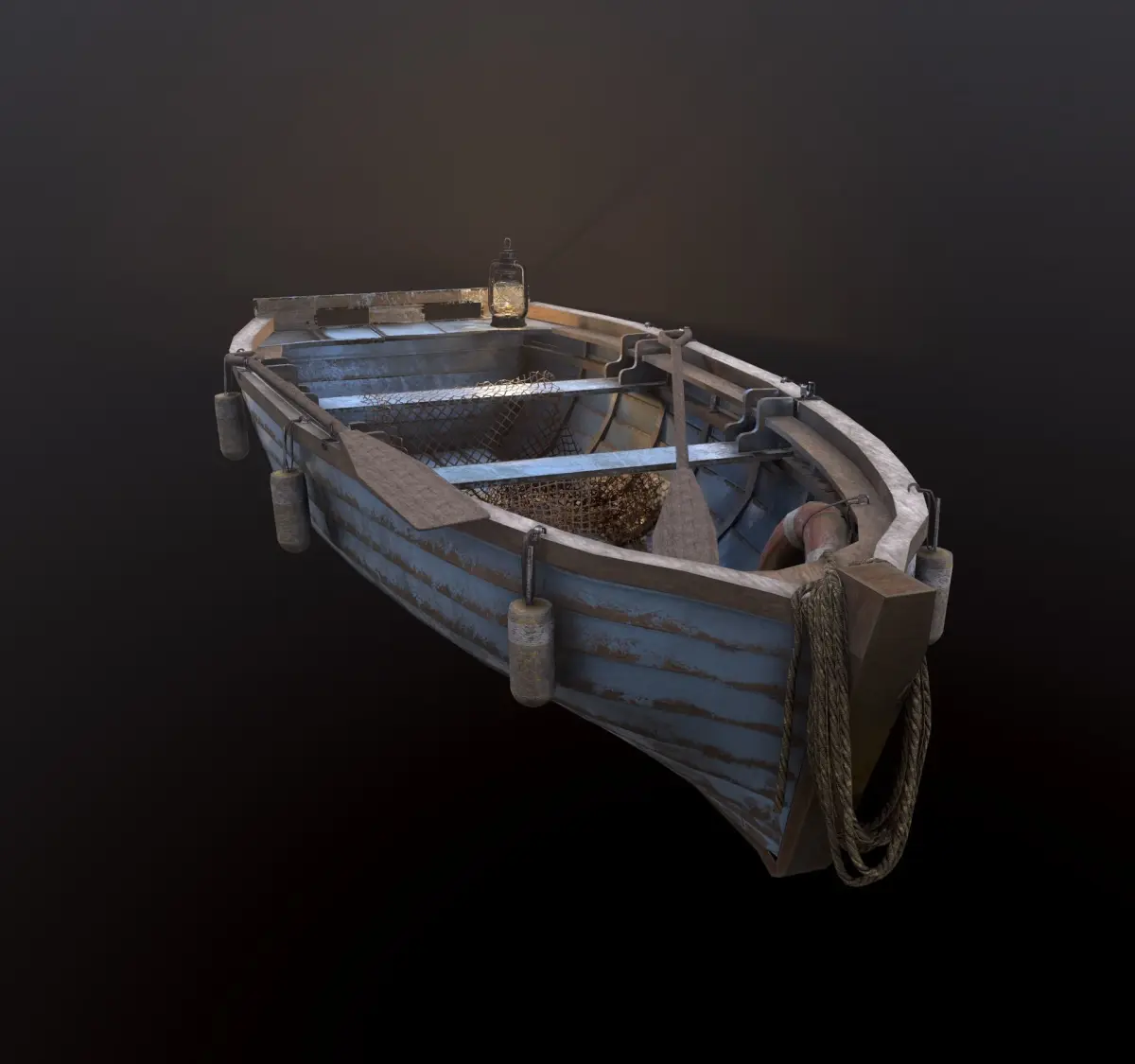 Low poly model of a fishing boat with net, buoys, rope, oars and gas lampThe model has five PBR materials and 4k PNG textures ( Base Color , Height, Metallic, Roughness, AO, Opacity, Emissive, Normal map OpenGL and DirectX)