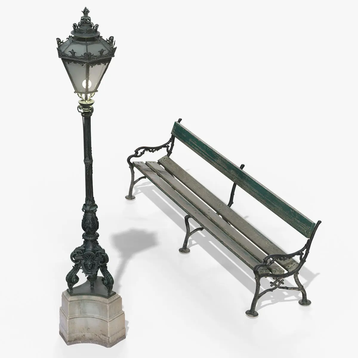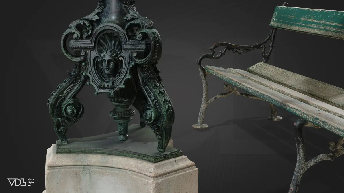 This combination of imperial street light and bench are original, hyper-realistic 3D scans from the Austrian Imperial Palace in Vienna, Austrias most prestigious cultural heritage sites and a central axis of influence on European history during the Habsburger Monarchy stretching from the late Middle Ages until the early 20th century. They are a testament to the Baroque era's artistic vision and the Habsburgs' desire to create a residence that exudes power, beauty, and sophistication. The ornamental design of the street lights includes motifs that are symbolic of power, nature, and mythology. The wooden bench, set in a wrought iron frame, is characterized by its unique traces of time making it rich in character and distinctiveness.