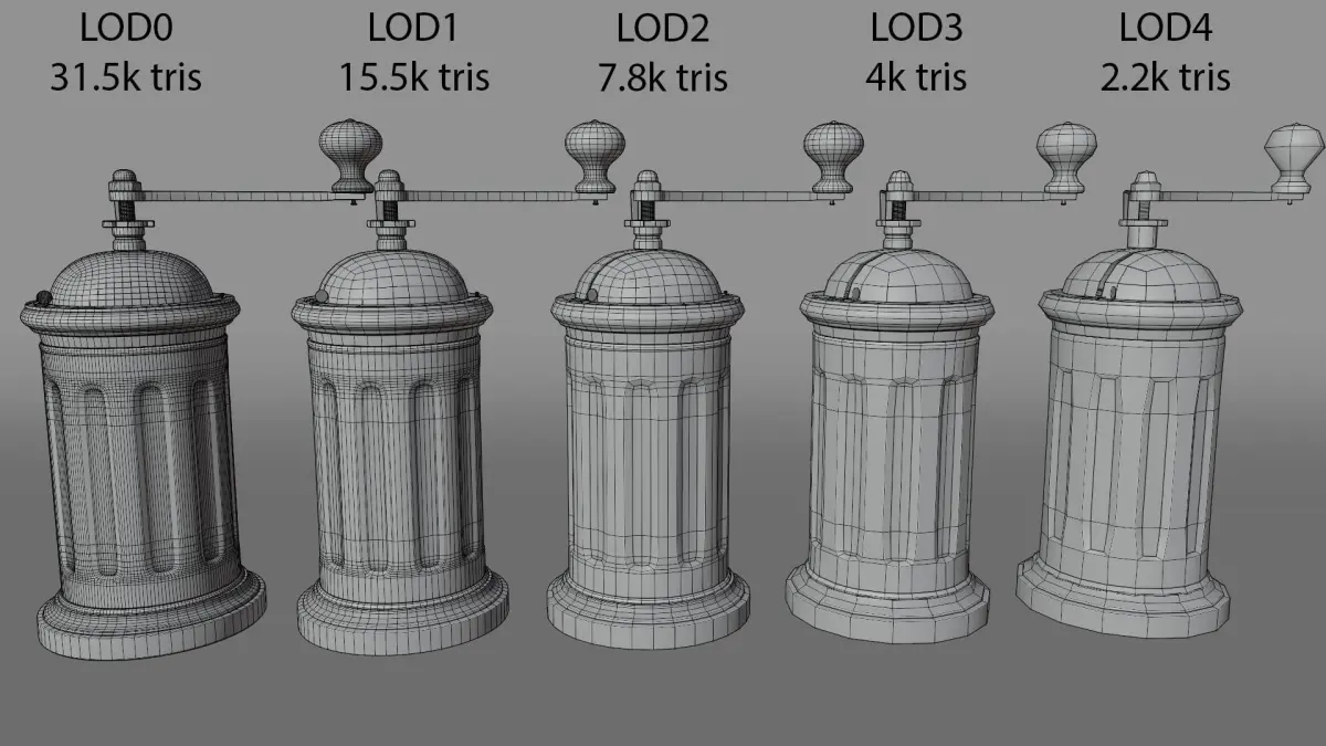 - 5 Levels of detail are accurately made by hand. Can be used as separate models. Perfectly match UVs - no UV movement among all LODs.