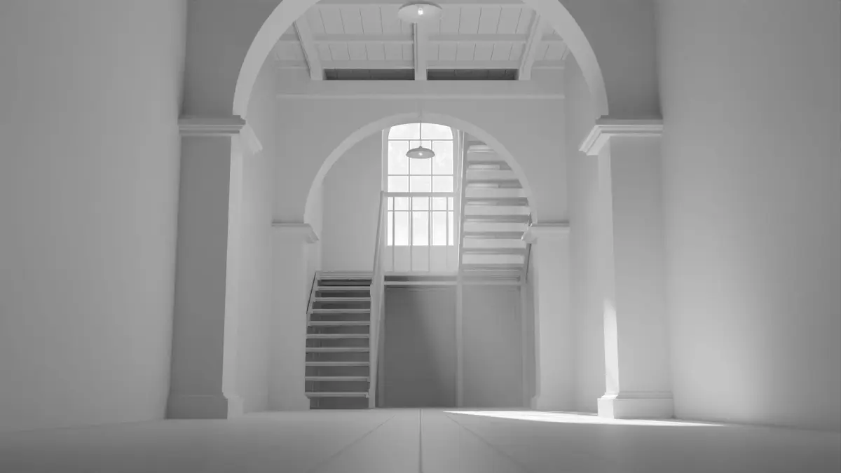 Old large room with a window and a staircase. The room is empty and the light is shining through the window