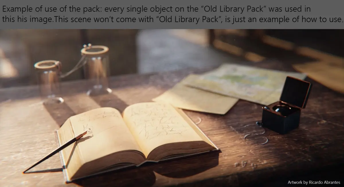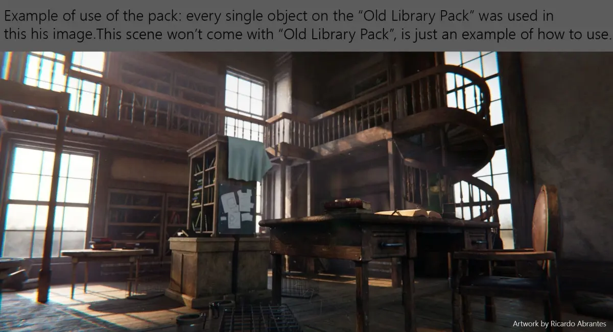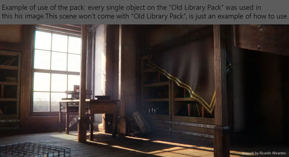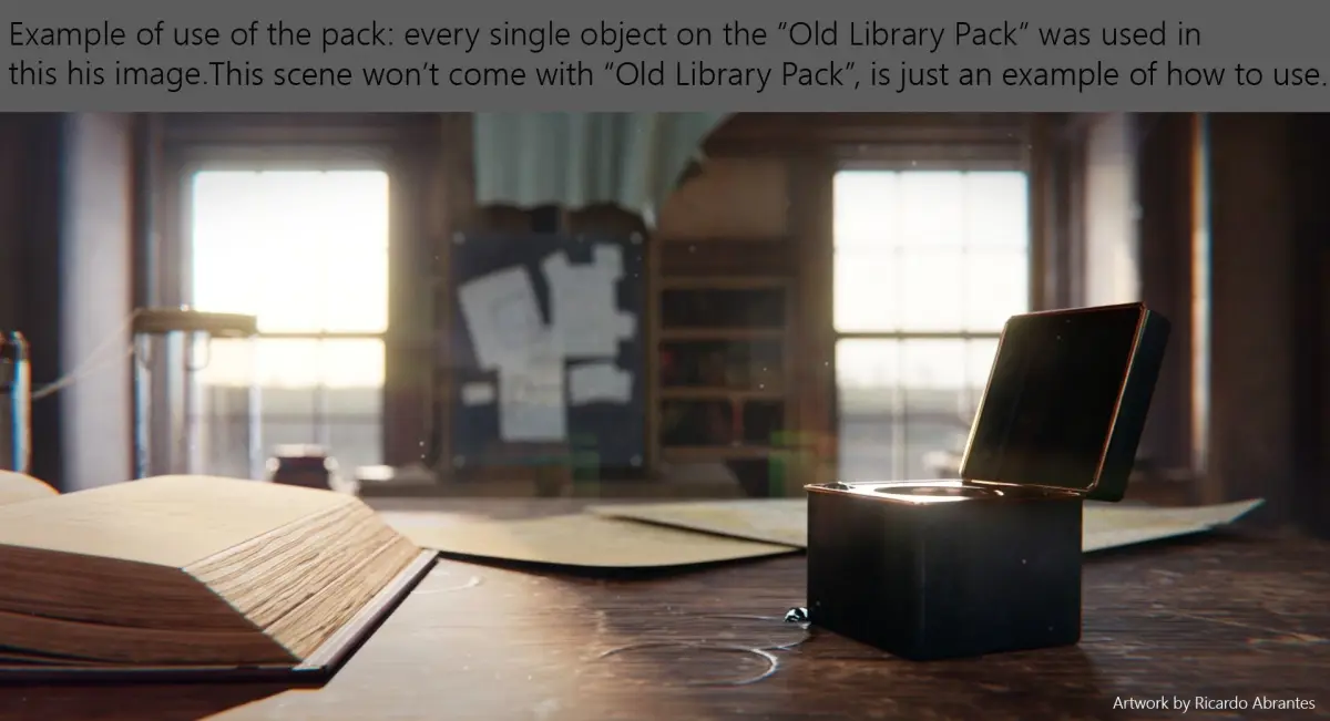-20 models with a subdivision mesh ready and a setup as an example, among them: a set of cabinets; a cage; a chair; a chandelier; a door; a jar; an open book; papers/map; a book pedestal; an old pen; pillars; planks; two bookcases; a stair; tree tables; a window; and a tablet setup as an example. -All the PBR textures of the 20 models;-Blender scene with all 20 models, with all the textures set to go (sRGB) and the render setup with 2 lights and a HDRI.-Every model will be available as a .obj file in case you don't work/use Blender, along with all the texture files as said, for you to set up any model anywhere.