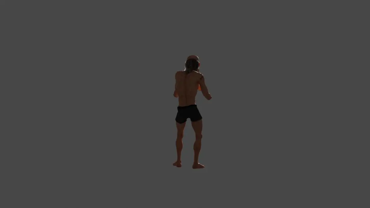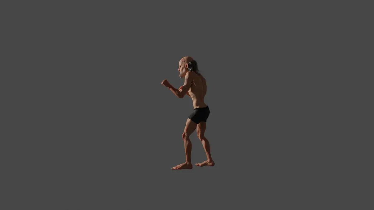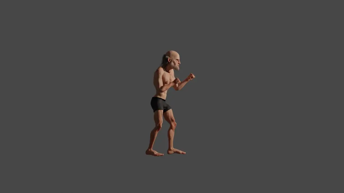 Realistic old male boxer with bruises and scars on his face and calf with half bald hair and in shorts. Realistic male model, 4k texture, rigged, UV.