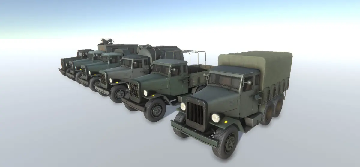 6 different trucks from the World War. Ambulance, machinegun, search light, closed, opened and container versions.The animated parts separated, the search light base and the lamp, and the machine gun parts also, so you can animated them. Emission texture for the lamps.The wheels also separated, for use animation. Detailed but merged undercarriage parts. 3 different texture set for each trucks, undercarriage, base and details.Texture sizes: 4096x4096 PBR rendering.Unity version available also with setuped colliders and materials.Unreal version is coming.