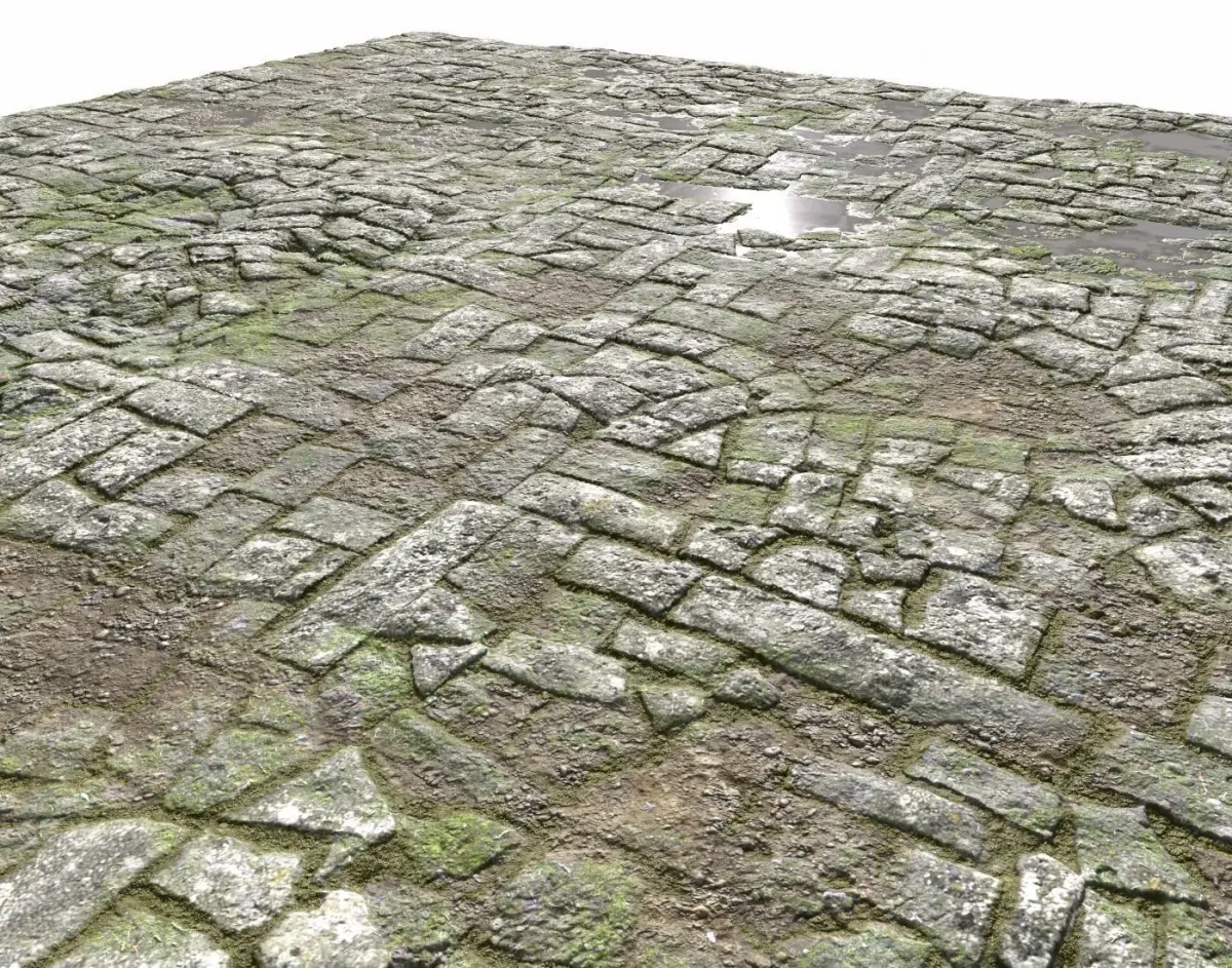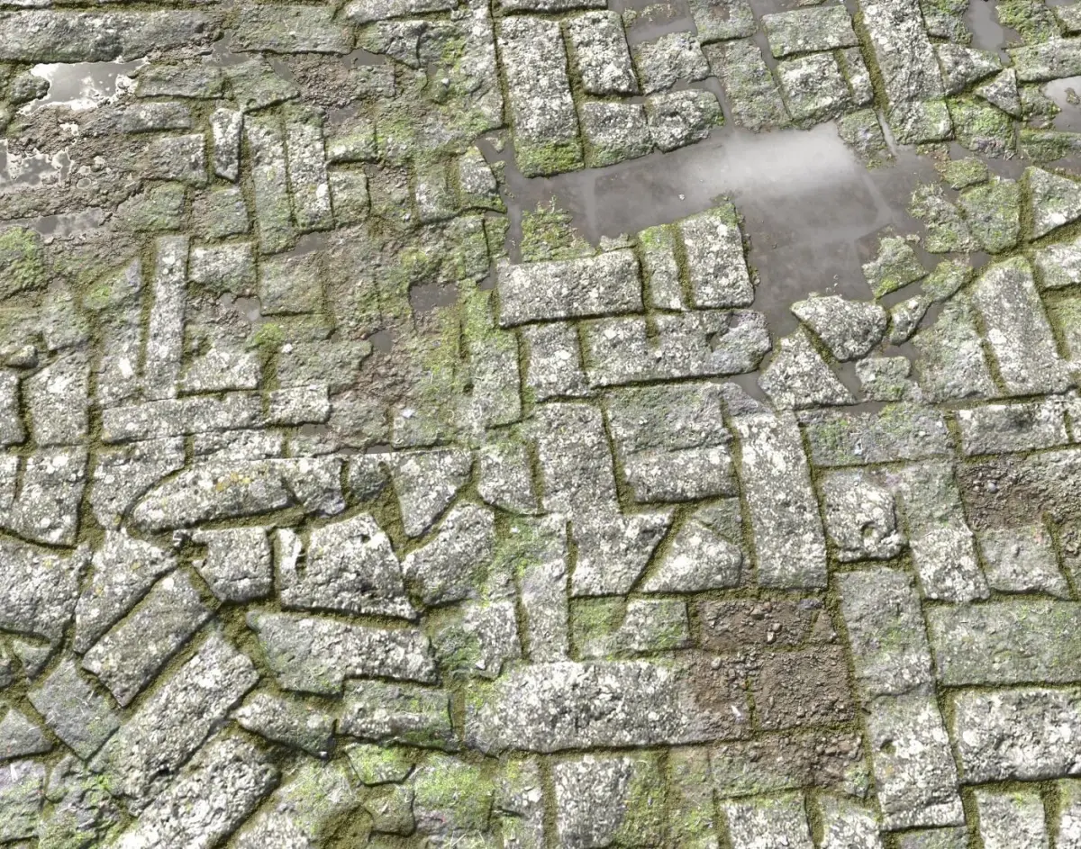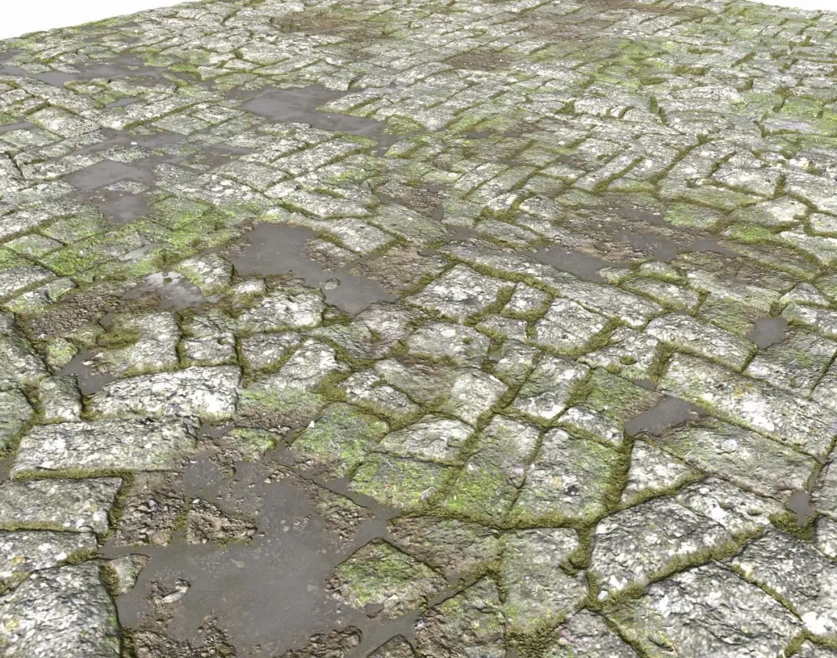 Old stone floor texture with moss, dirt and puddles suitable for ruins, ancient temples, castles etc..., consisting in 4 texture sets containing: