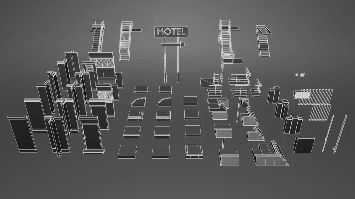 The aim of this kit is to create a retro-style motel or hotel, including exterior and interior details. Utilizing modular building blocks that are optimized, realistic, and easy-to-use. Enabling fast assembly and infinite variations.