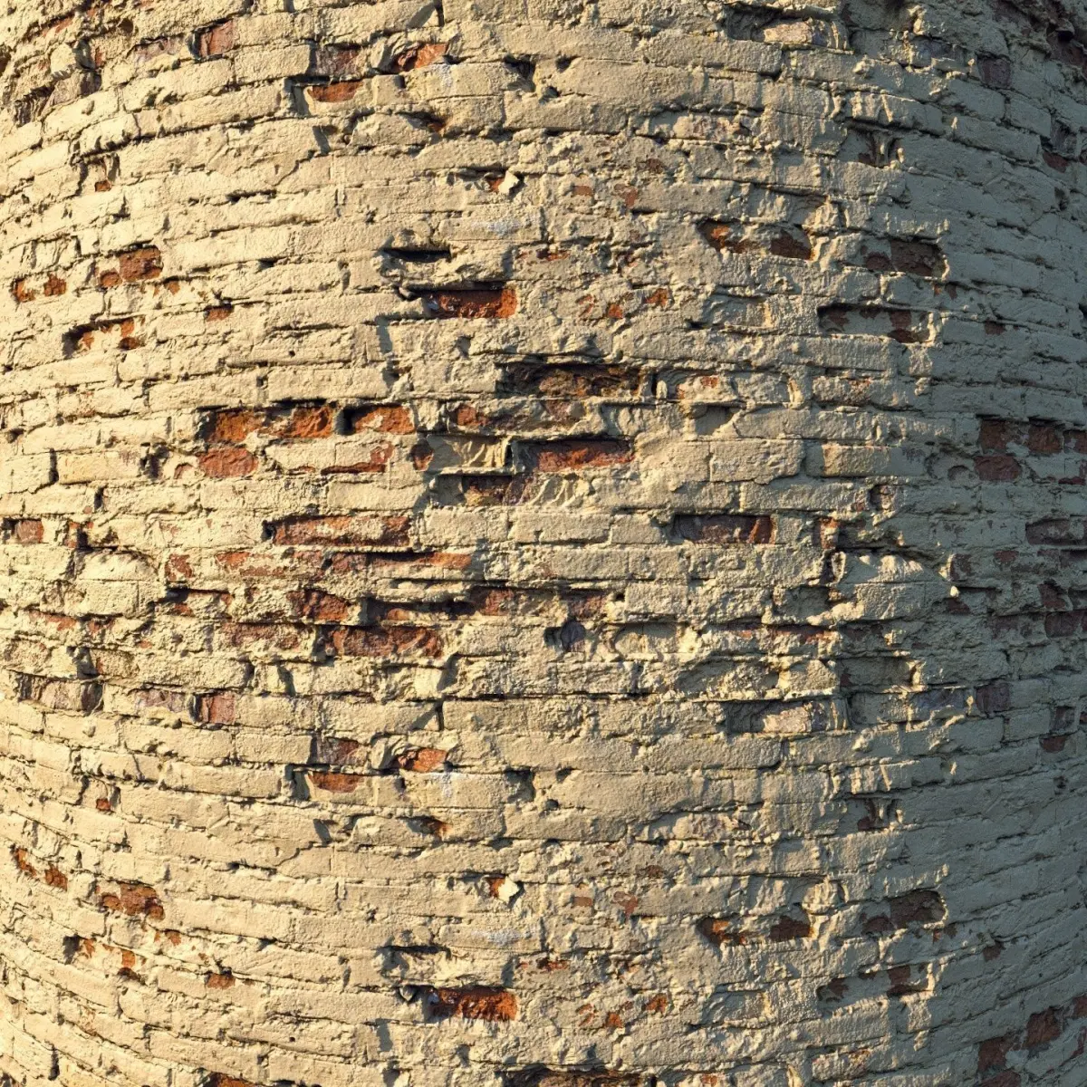 8k Old damaged brick wall material with a layer of peeling paint, original color is light yellow, but you can also easily change the color by mask by enabling and adjusting the VrayColor in the Diffuse / ColorCorrection map. When importing from FBX, the color mask is removed.