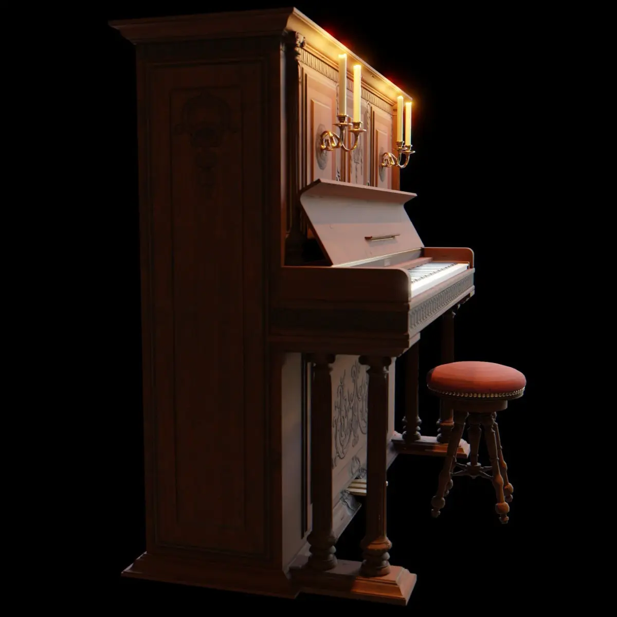 This piano is made of carved wood, with a pair of golden chandeliers to light the music sheets. There is also a seat for the pianist to sit. The hood can be animated to open and close (watch the YouTube video).