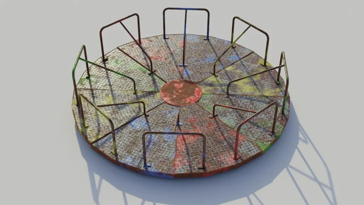 The playground models are texture to look old and worn with rusted and painted metal. They are styled on vintage playground equipment.