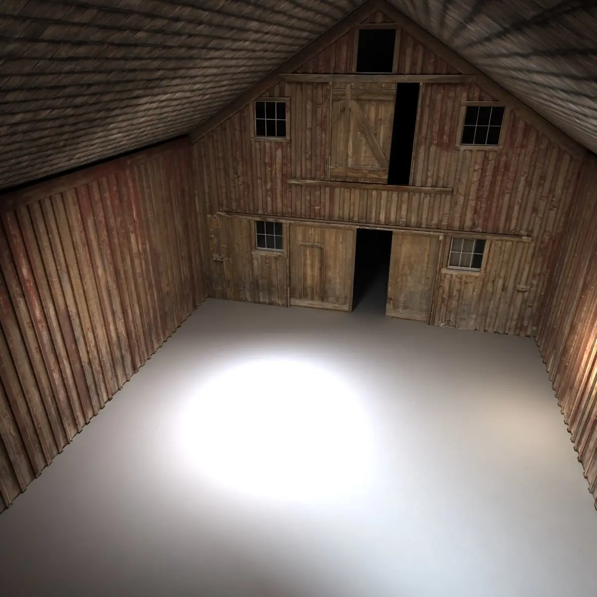 3d model of old red barn with interior walls and animated door.