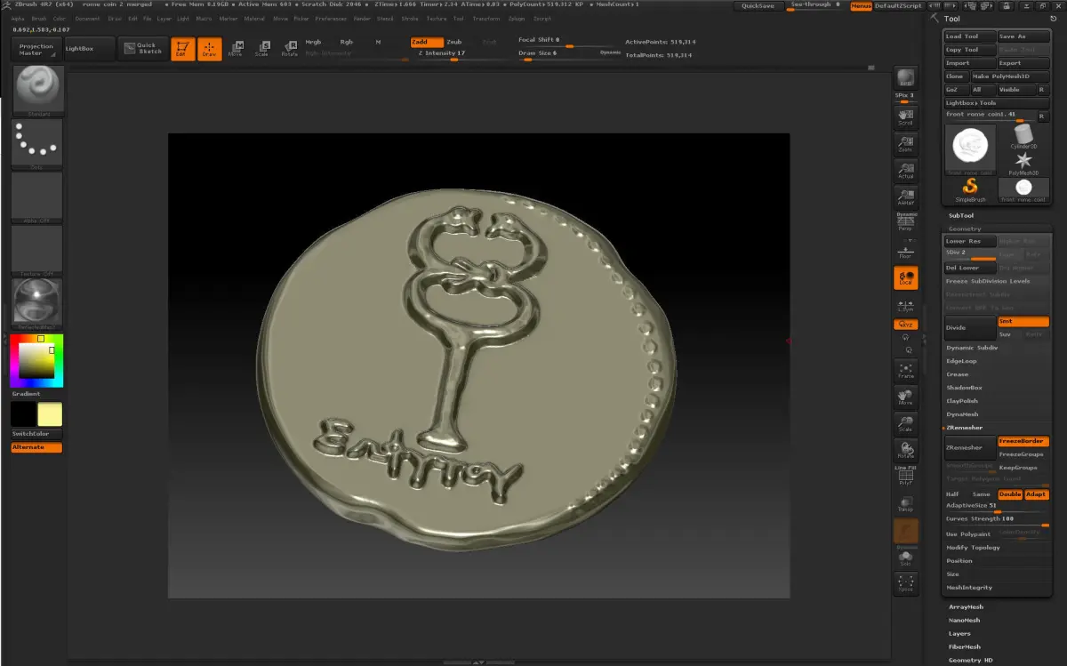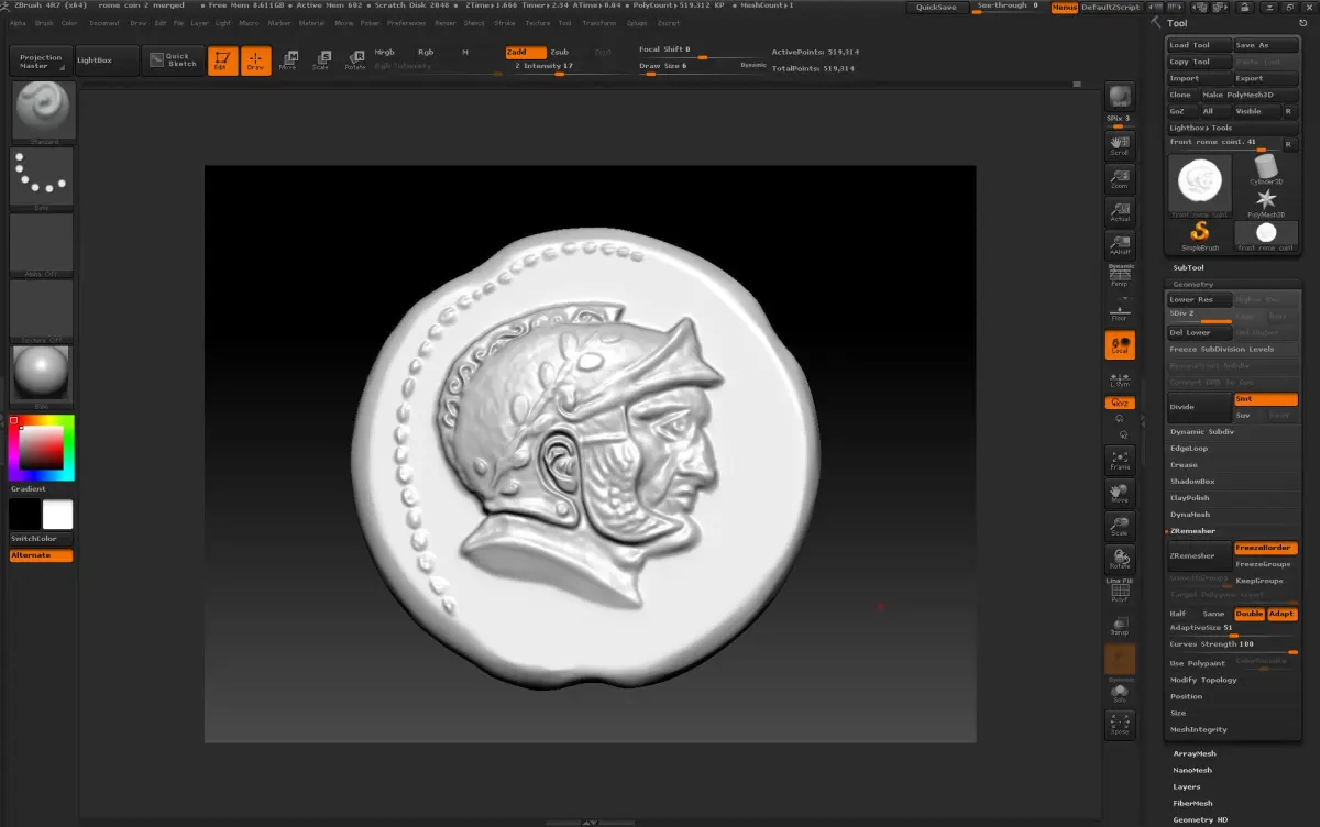3d print model of old Rome coin.Modeled in ZBrush and 3ds max.2 files,one with higher relief on the back sidemeasure 3,4/3.4/0.6 cm
