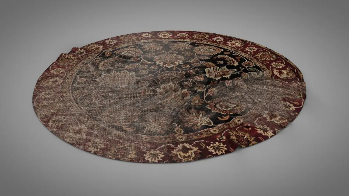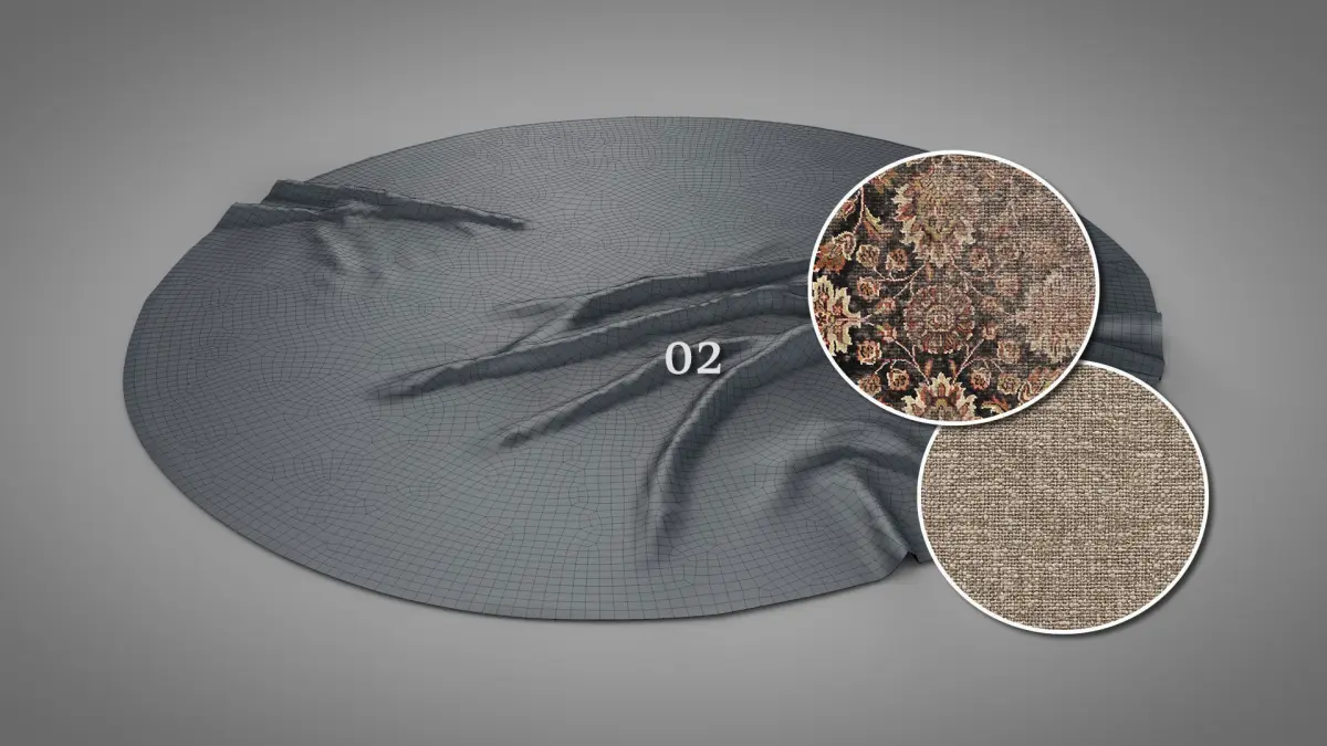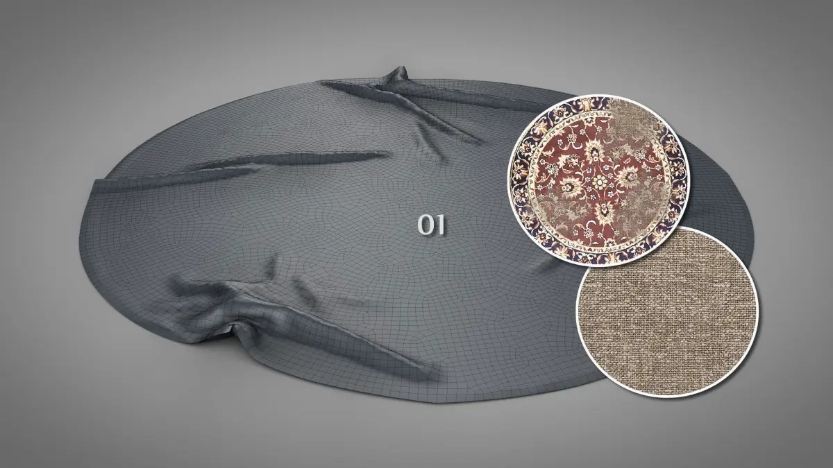 There are 10 different poses of lowpoly round carpets which are sitting on floor or another flat surface.