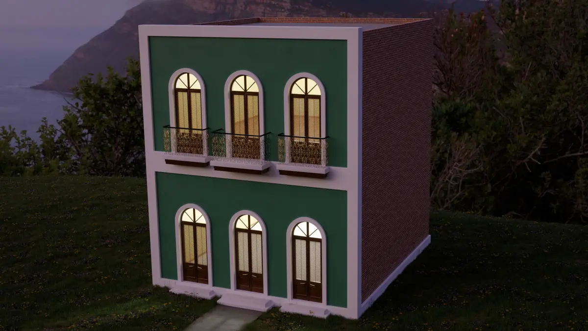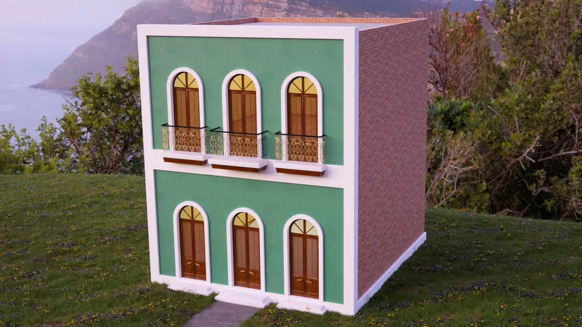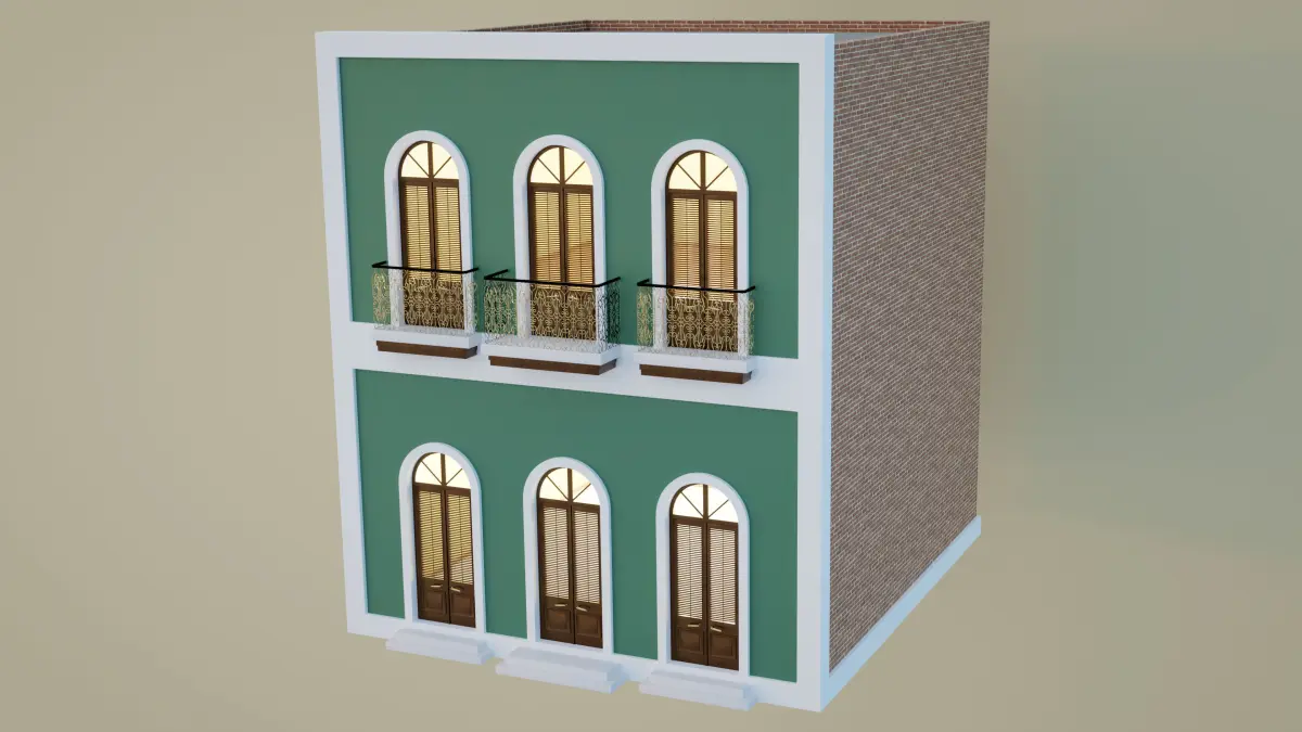 Model contains exterior facade, brick side wall, woodedn door and windows and simple interior.