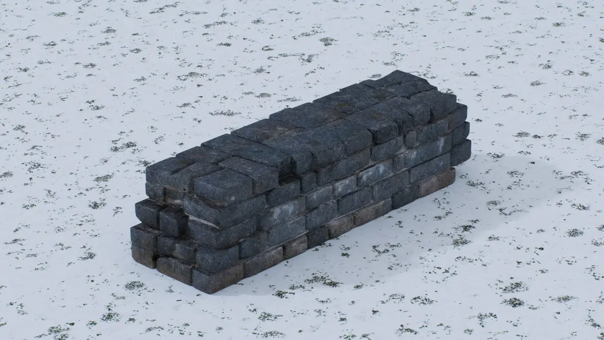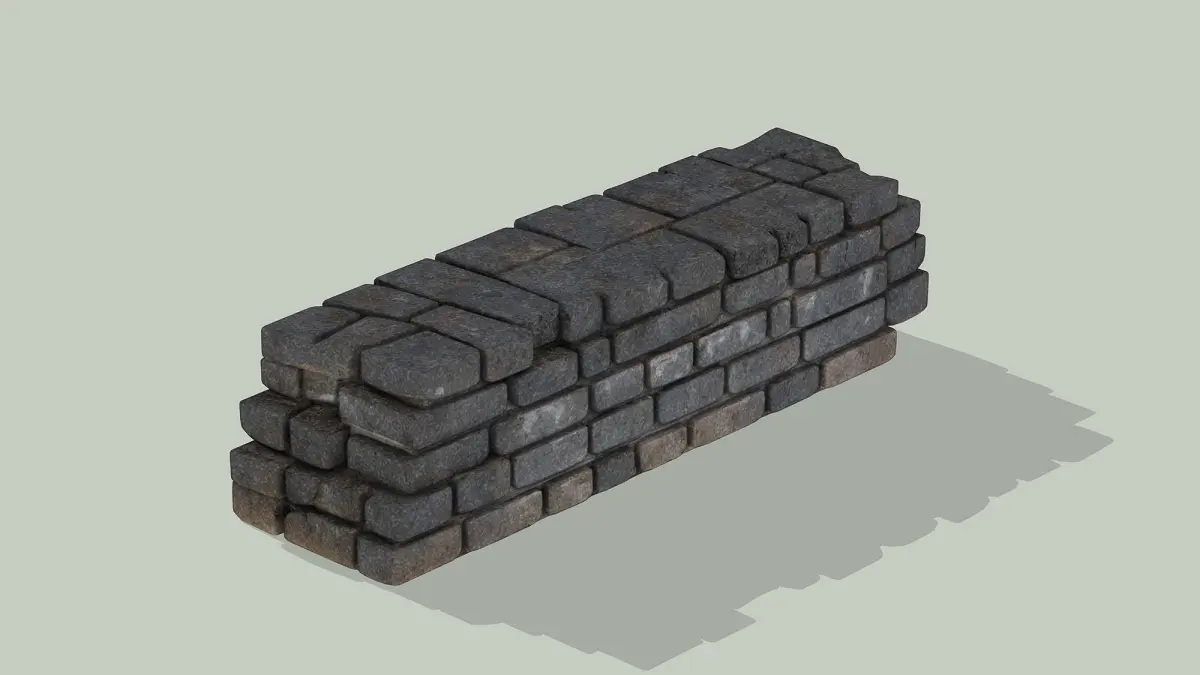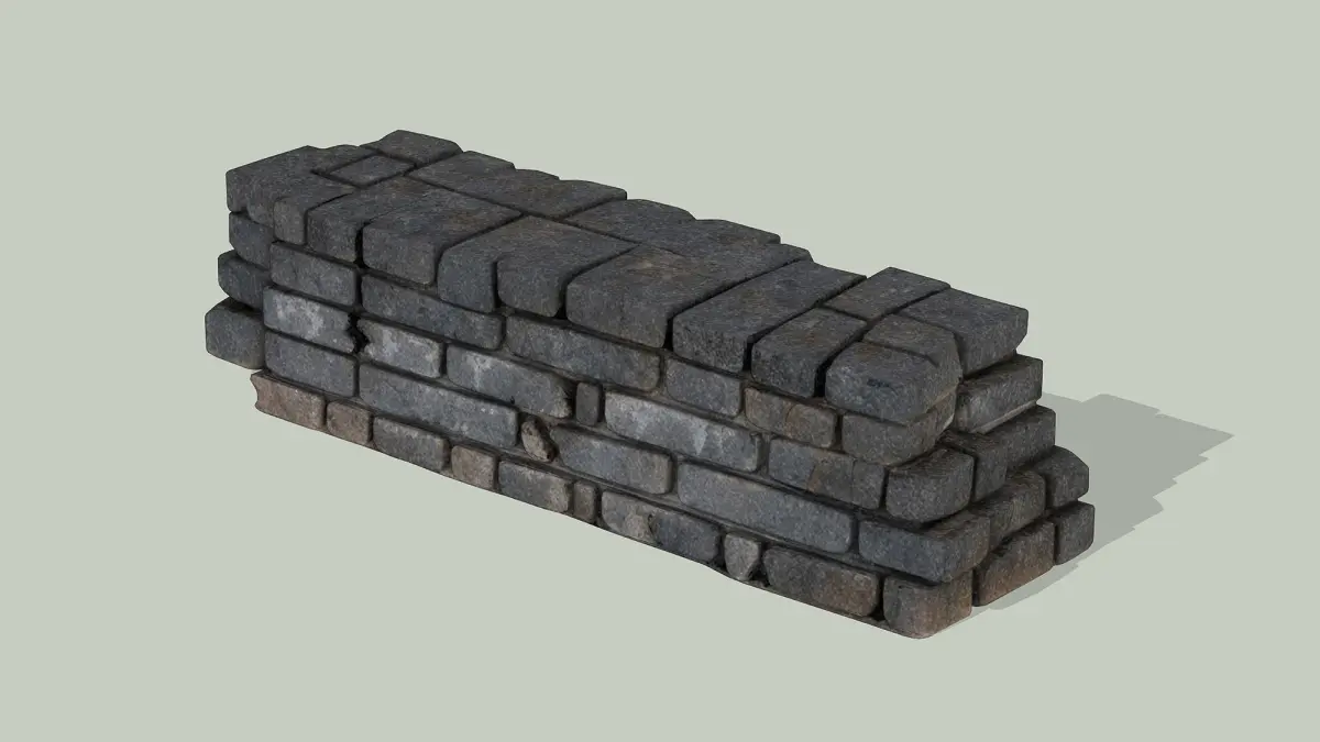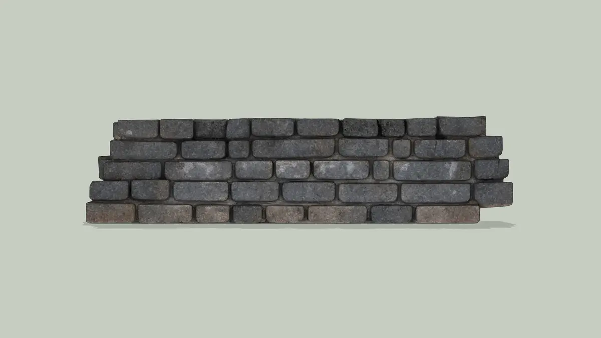 This 3D low-poly model showcases an old stone wall, crafted with a rugged and weathered aesthetic. The structure features a stack of uneven, dark stone blocks, some showing signs of cracks and erosion, mounted without mortar for a rustic look. Subtle shadows enhance its textured surface, reflecting years of exposure to the elements. Ideal for historical reconstructions, medieval game settings, or landscape designs, this model captures the timeless durability and charm of ancient masonry.