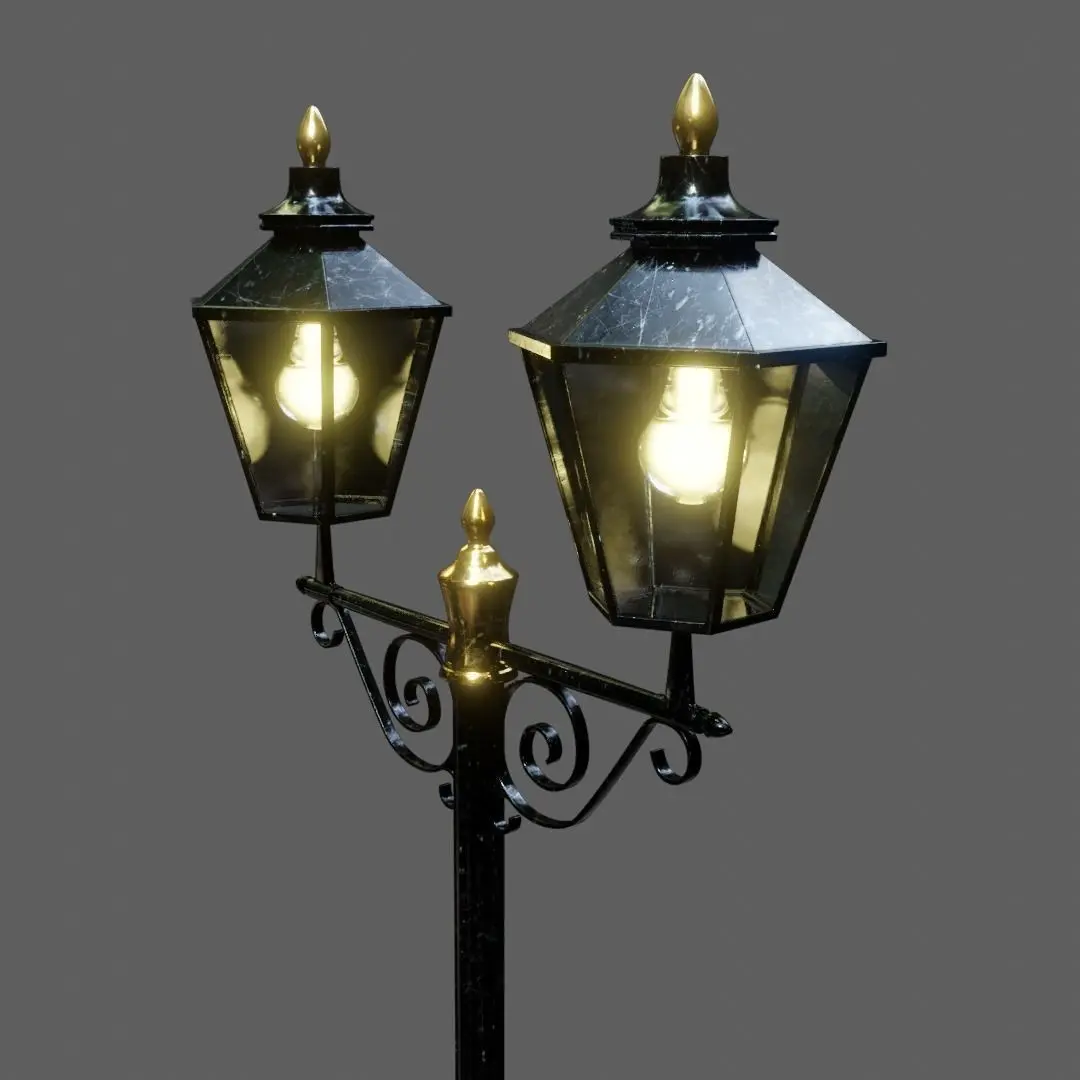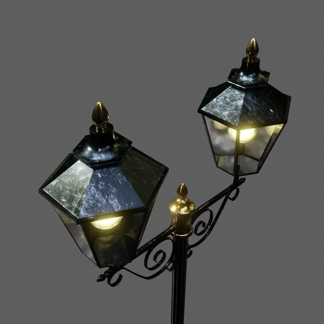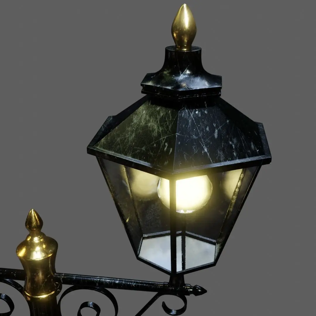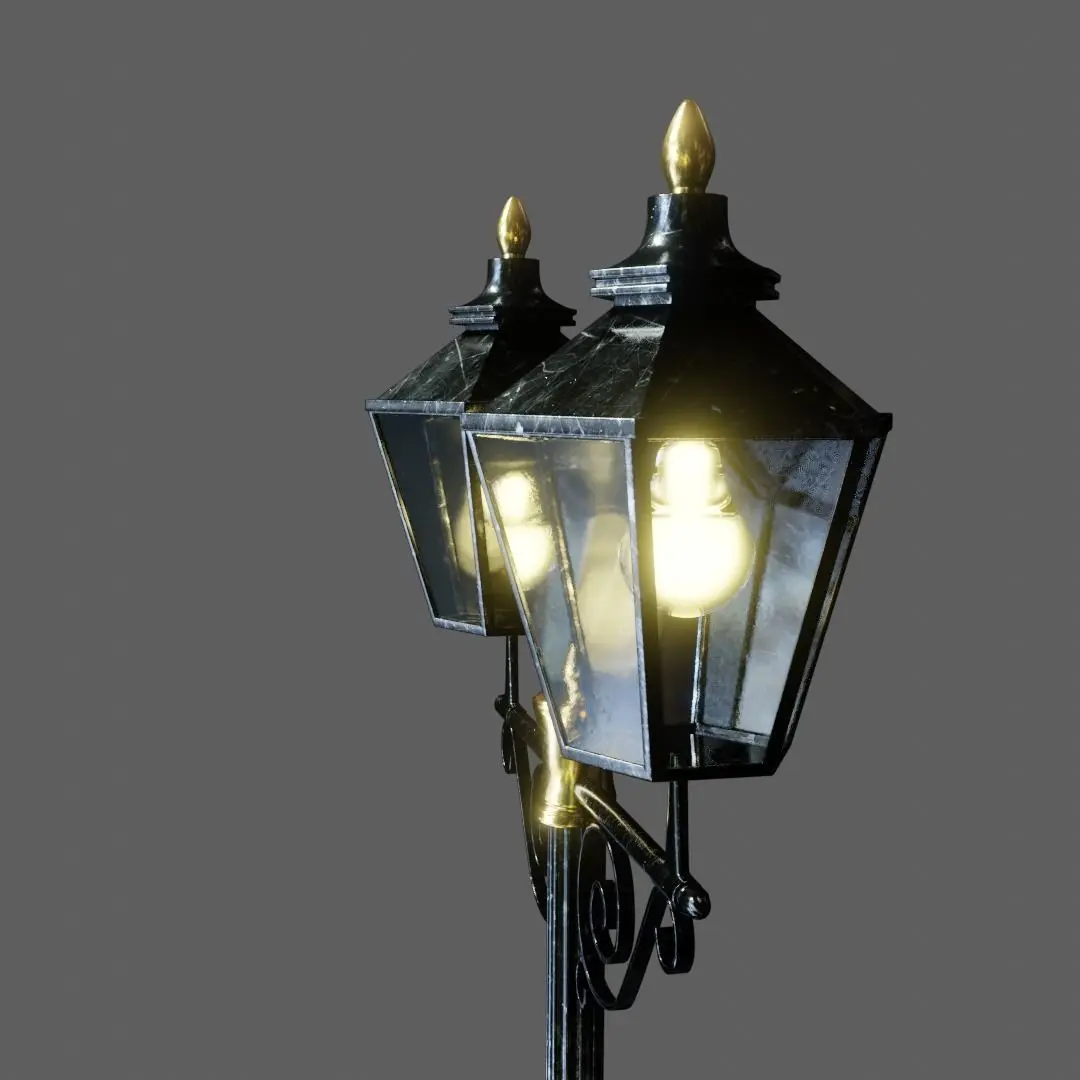 A 3D model of an old street light with scratched black metal and bronze...................................