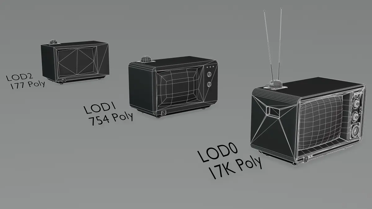 - Separated in 3 objects: antenna (removable), power switch (to be able to turn between on/off), TV Body.