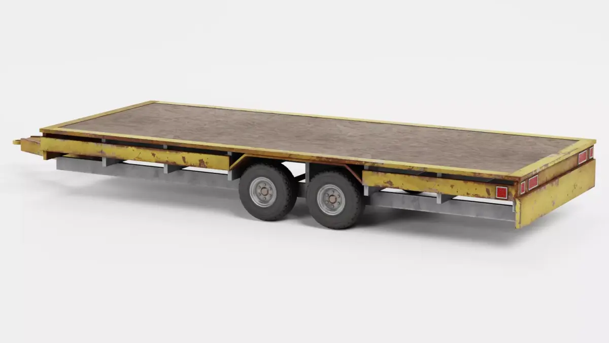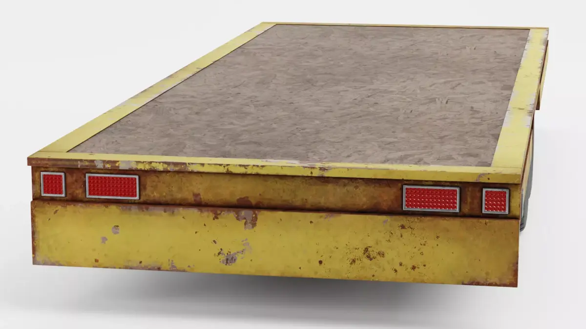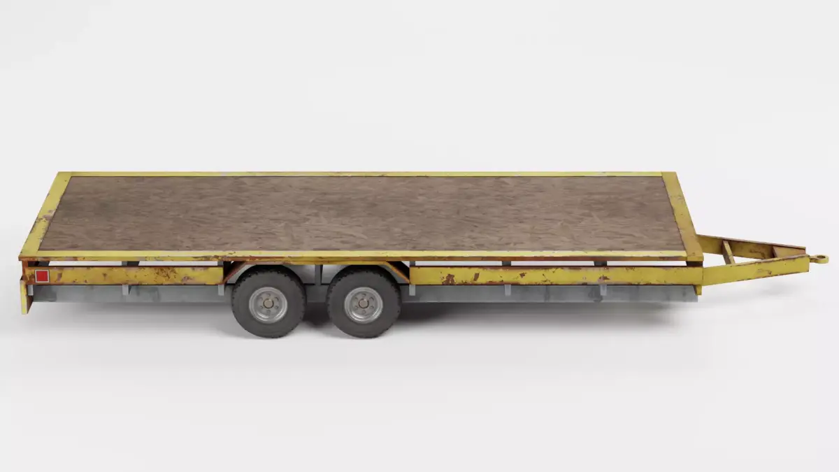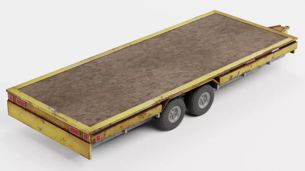 A high-quality 3D model of a metal-frame trailer with a realistic wooden board platform. This model captures a balanced blend of industrial and worn materials, delivering a grounded, authentic look ideal for realistic transport or environment scenes.