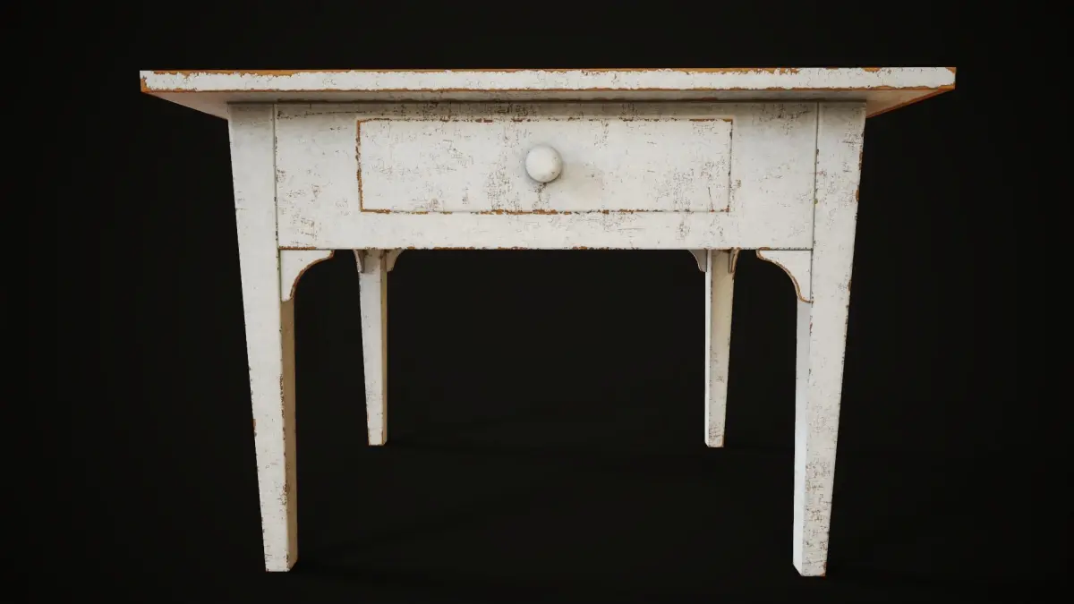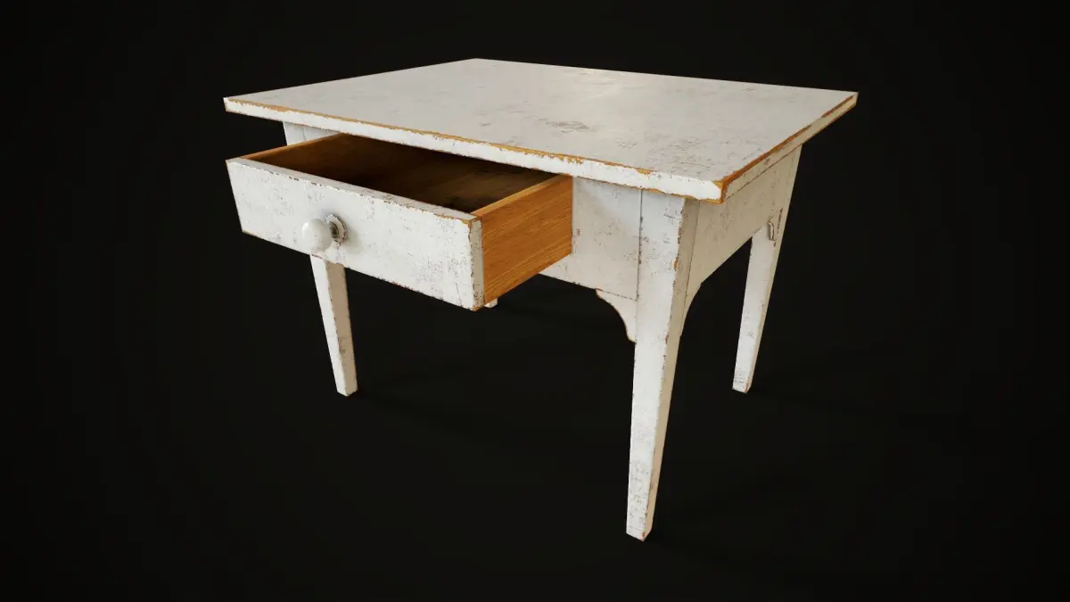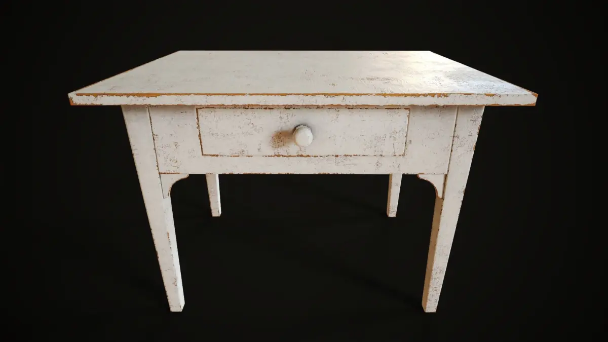 Model of a white painted desk with drawer.