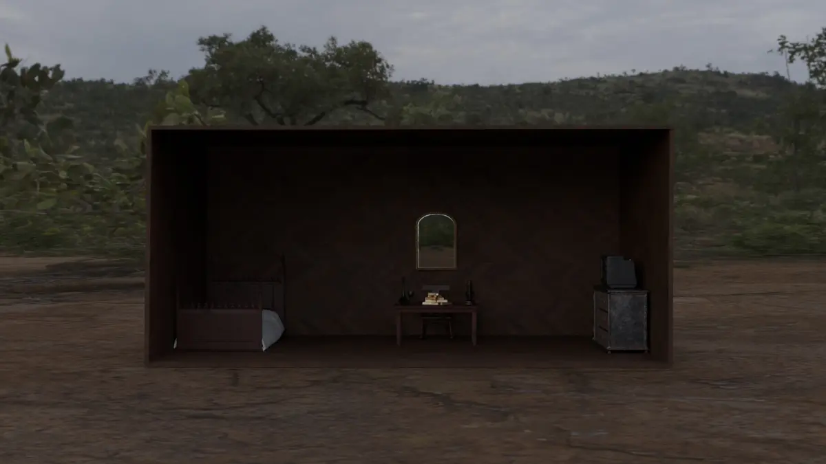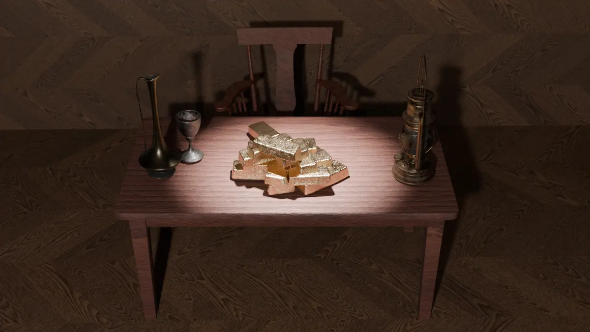 Step into a story-rich, vintage interior scene where history meets sudden fortune. This meticulously crafted 3D environment showcases an old, rustic room furnished with antique elements — including a traditional bed, vintage drawers, and worn decor — centered around a striking pile of gold bars displayed on a wooden table, hinting at a life-changing discovery.