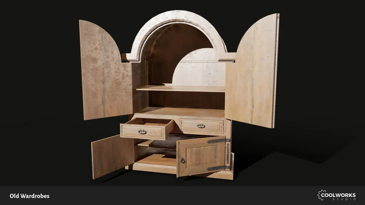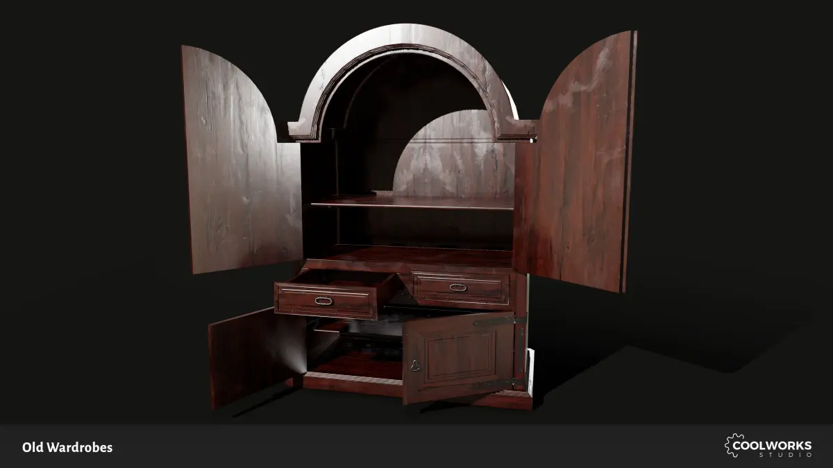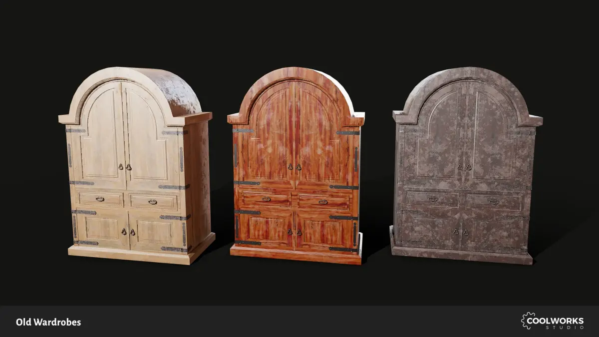 1 wardrobe tileset mesh (UV mapped) in FBX format, LoDs included (16087 / 4371 / 3657 / 1003 triangles for the whole assembly)