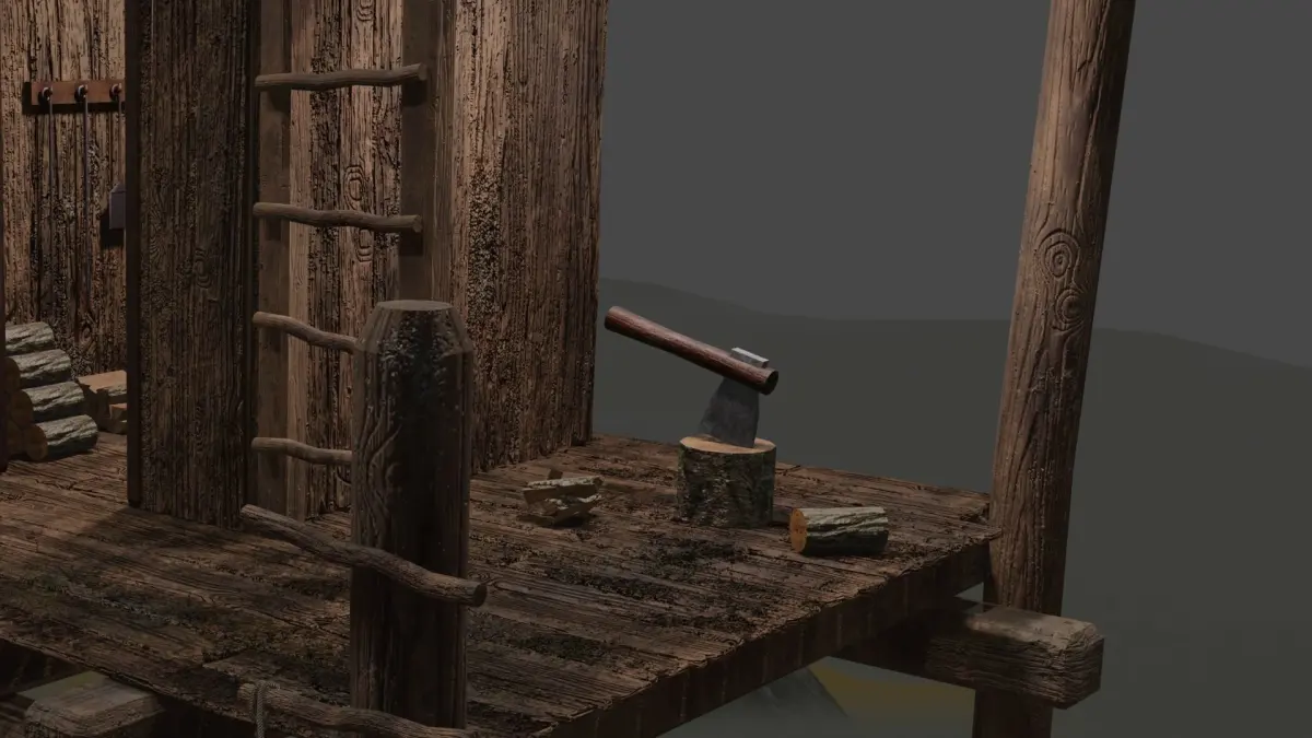 Adjacent to the cottage, a well-worn axe leans against a stack of freshly chopped firewood. This detail adds authenticity to the scene, reminding us of the daily rituals and hard work that life in such a rustic retreat might entail. The scent of freshly split wood fills the air, adding to the immersive experience.