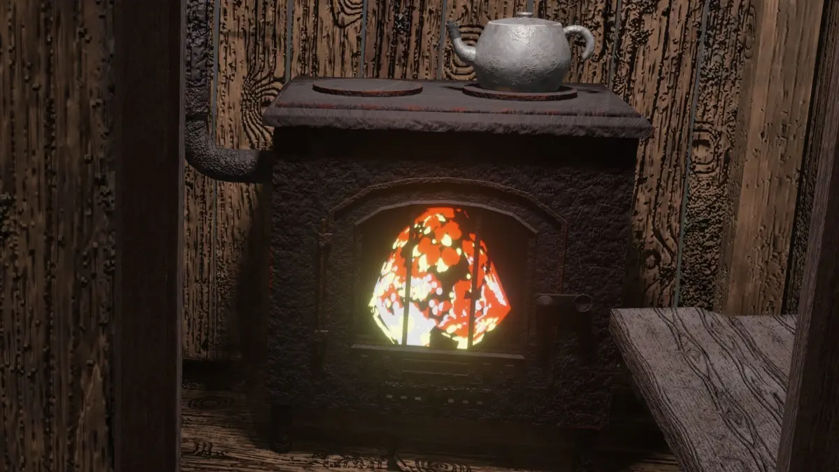 As you explore this scene, your eyes are drawn to the centerpiece of the cottage - a sturdy, cast-iron stove. The presence of this timeless piece of equipment suggests a cozy and inviting atmosphere within, where the warmth of the fire dances and casts a comforting glow on the wooden beams and aged furnishings.