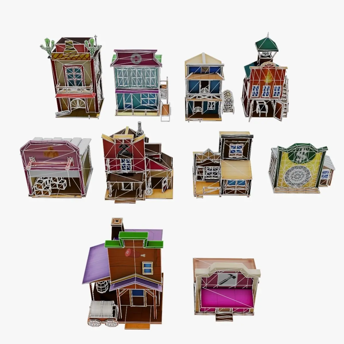10 variations of low poly old west building.