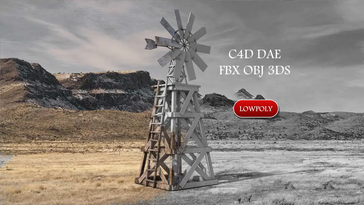 Lightweight but nice looking western windmill model. Copy color channel to bump channel for better renders. C4D format also has bump channels.