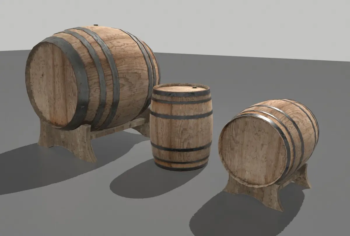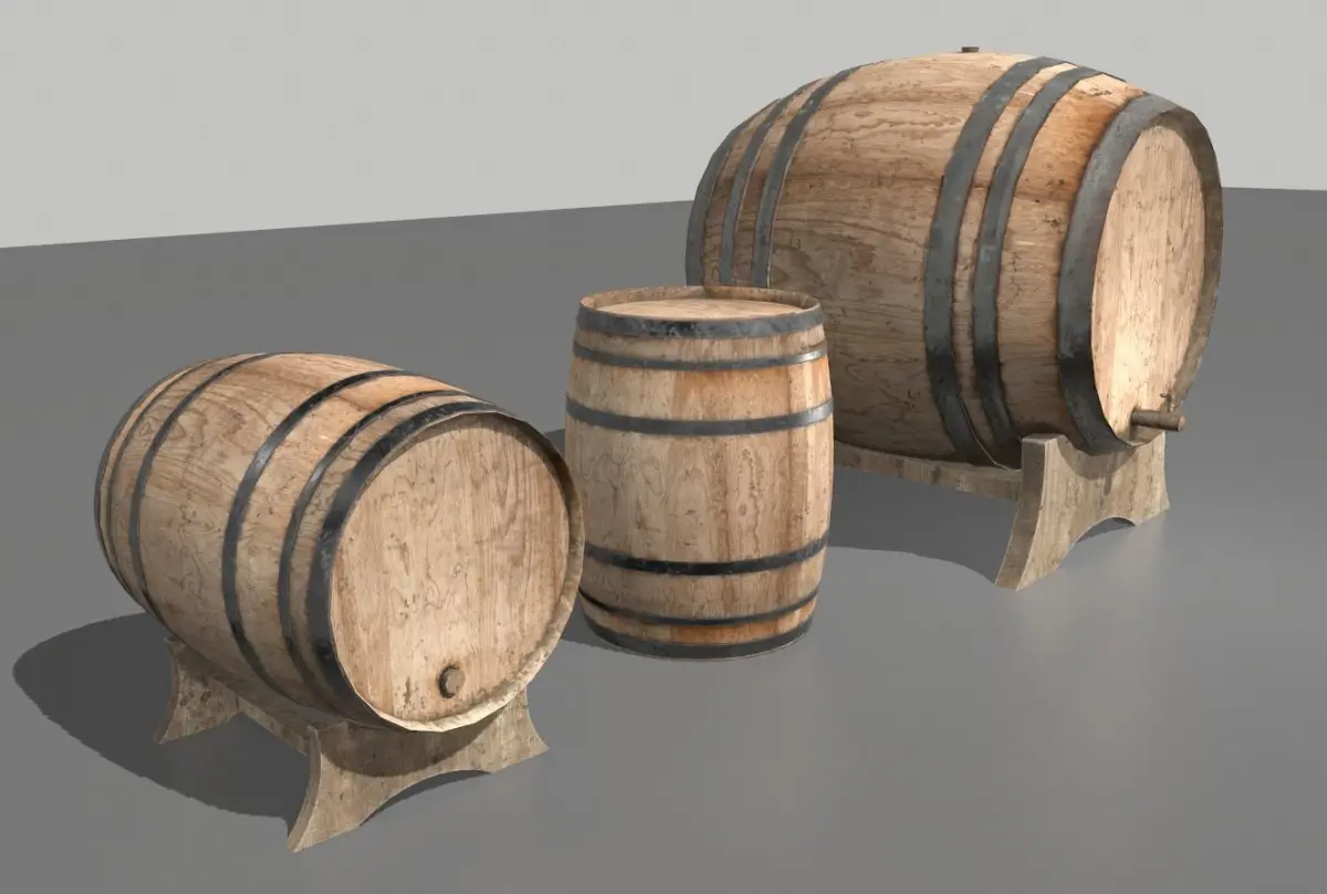 2 wooden barrels based in realistic ones and with 3 pieces, 2 barrels and 1 support.