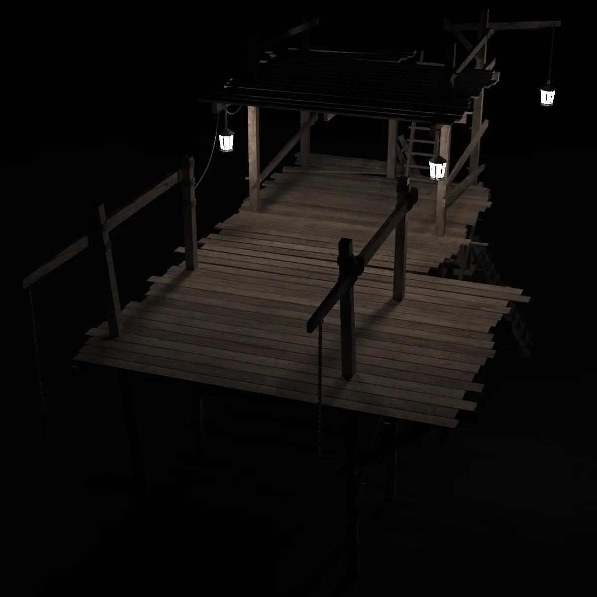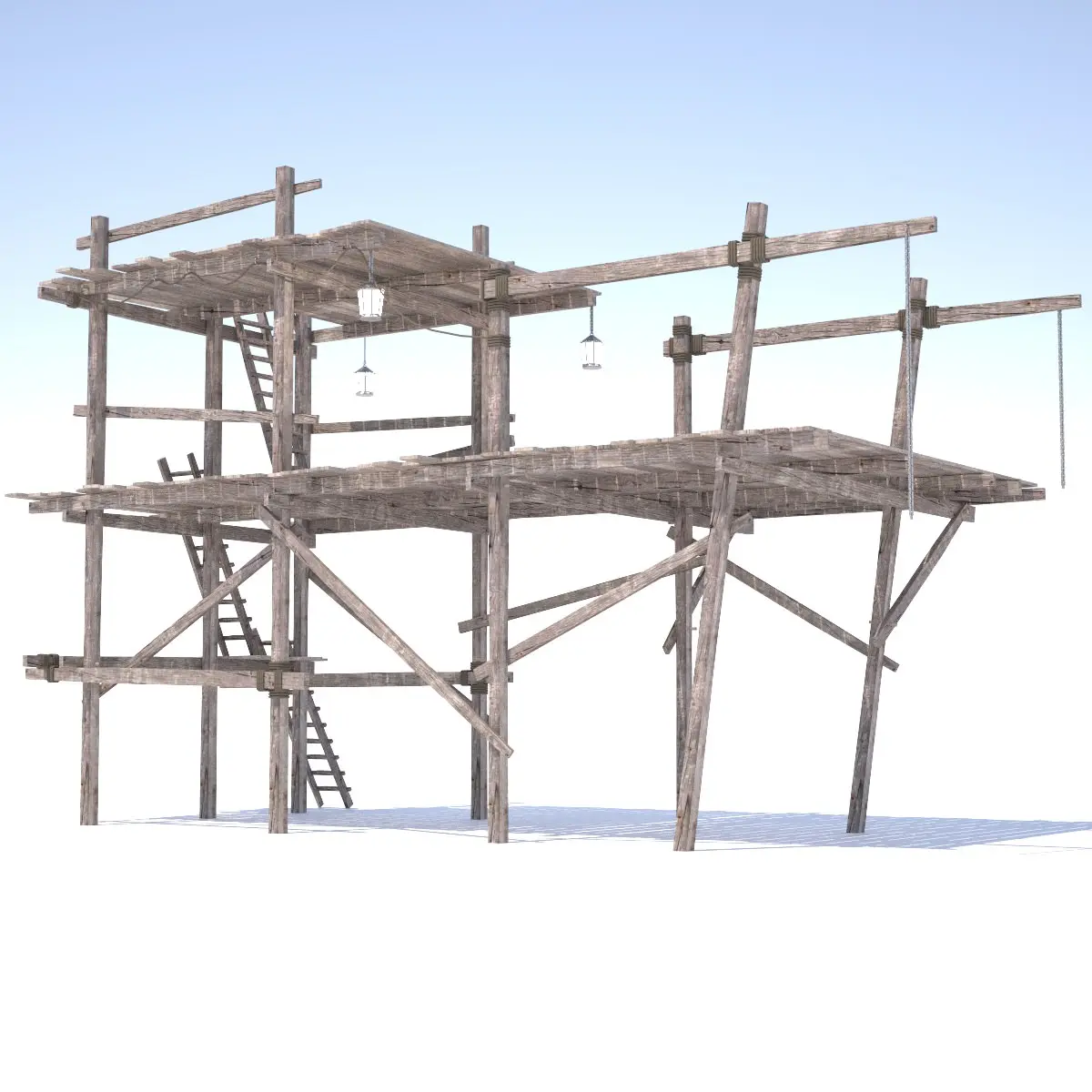 A wooden scaffolding usable for medieval or fantasy scene. The model is detailed including bolts, dowels and lanterns available for night rendering.