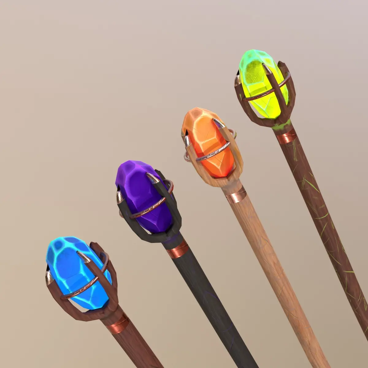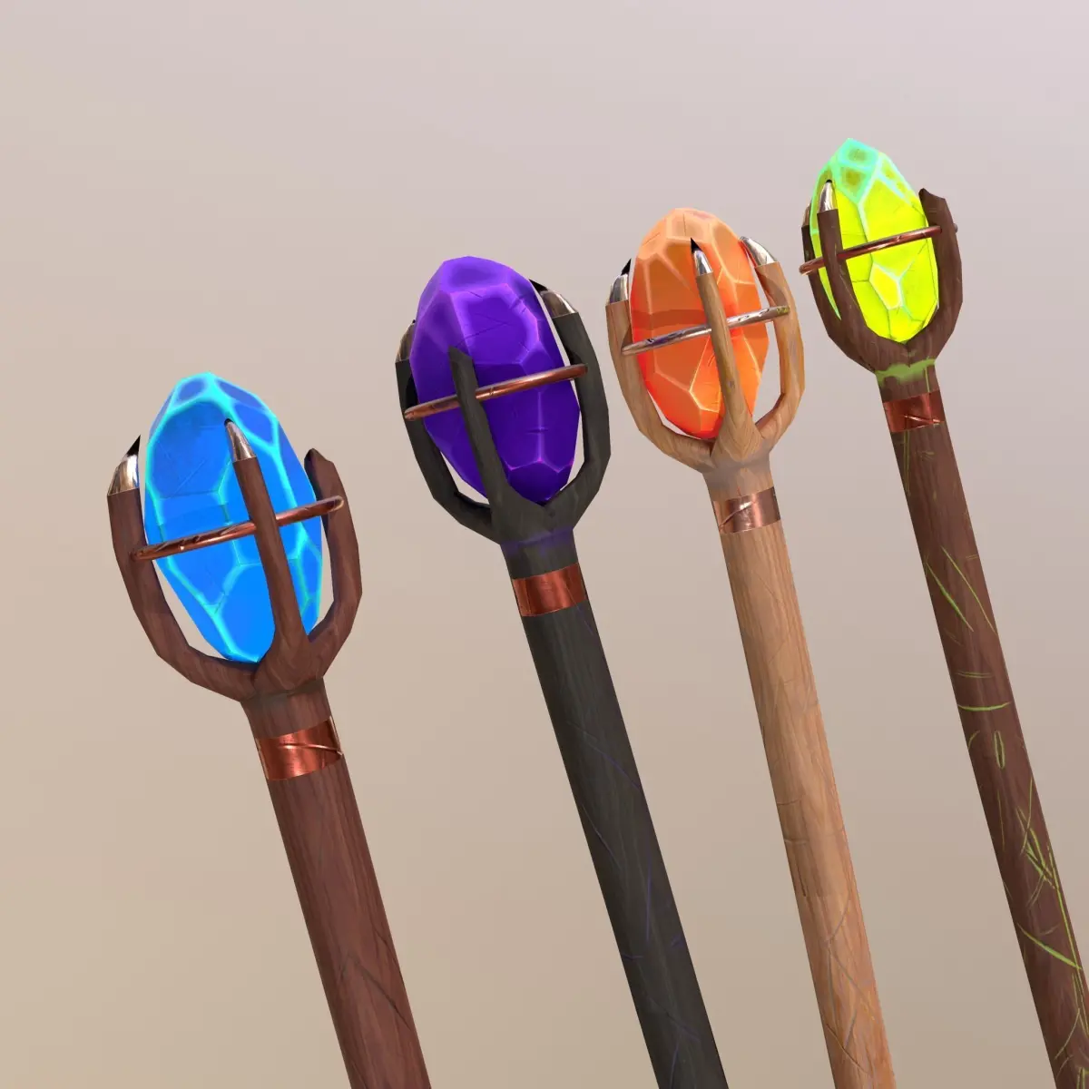 Texture set: Fiery staff, Acid staff, Water staff, Dark staff.