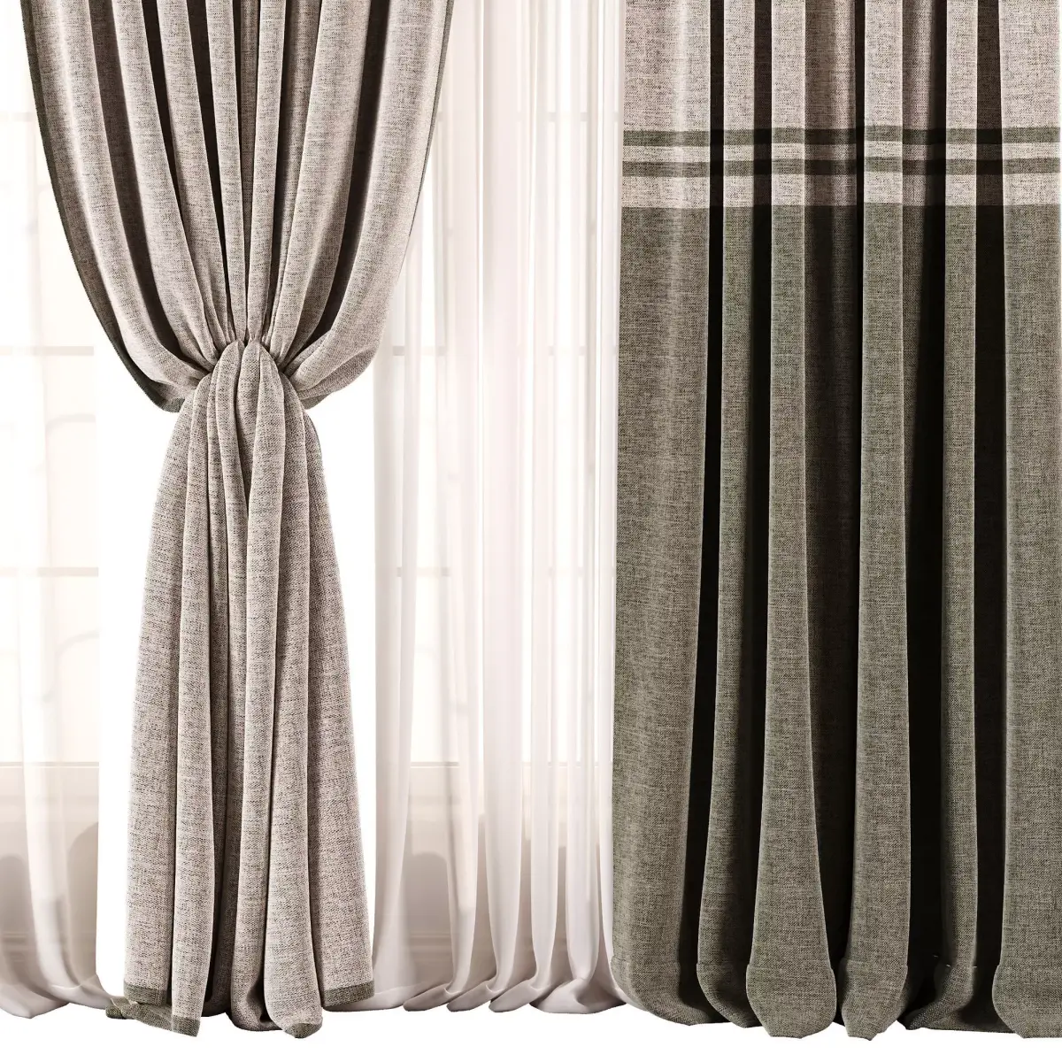 Key Features: • Natural linen texture with soft folds and realistic material setup • Includes decorative trims and a sheer curtain layer for depth and light diffusion