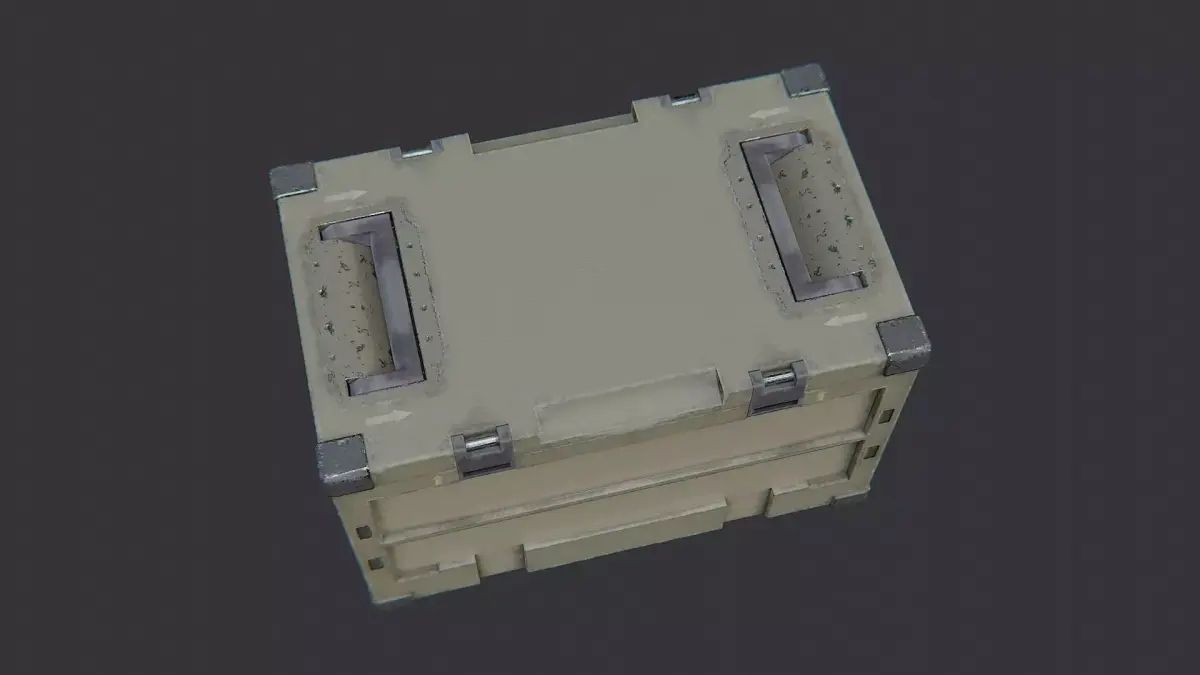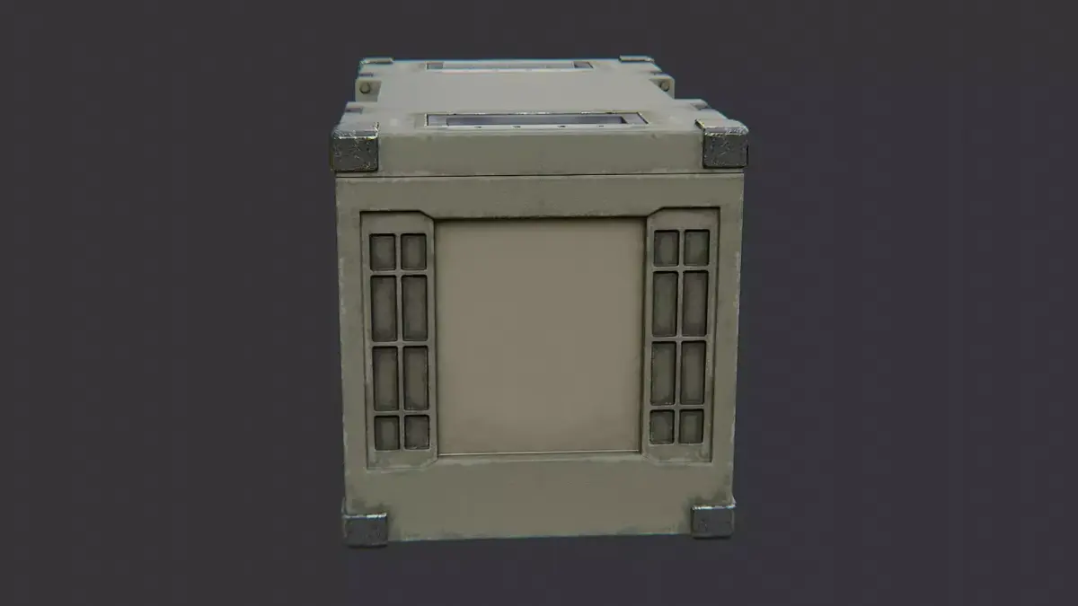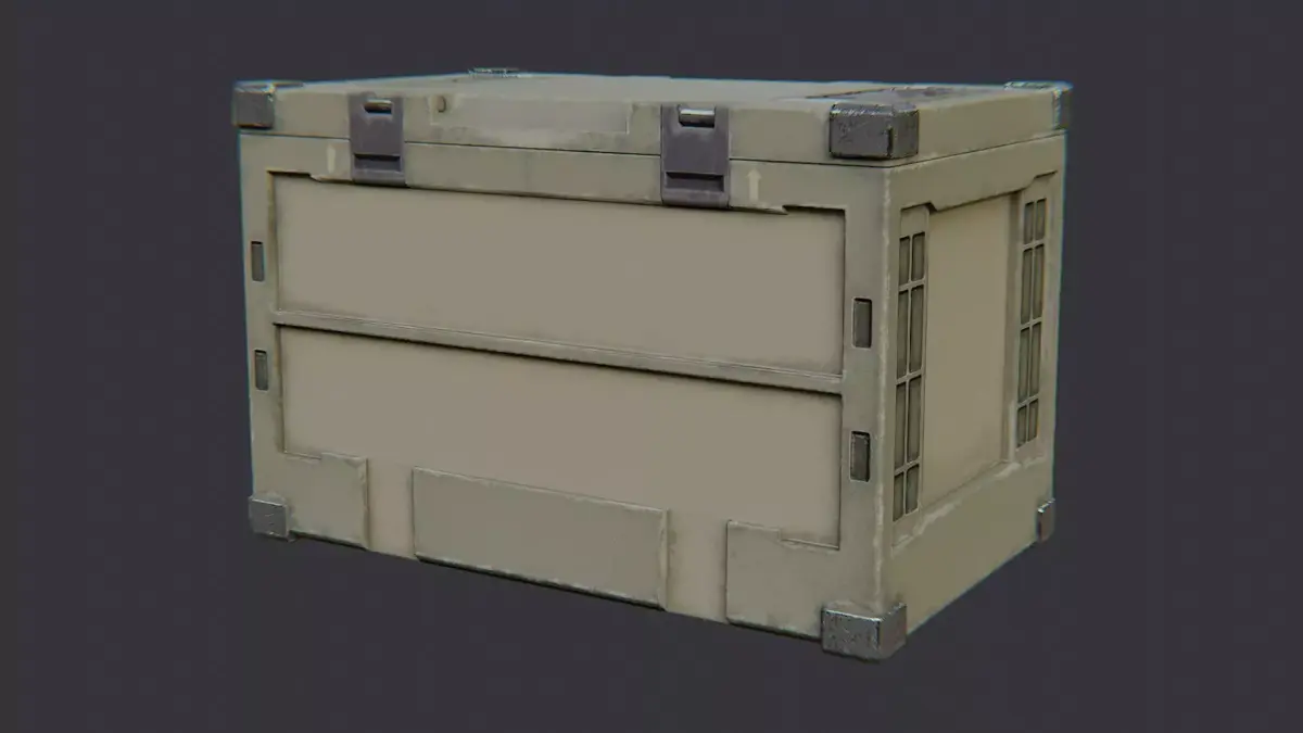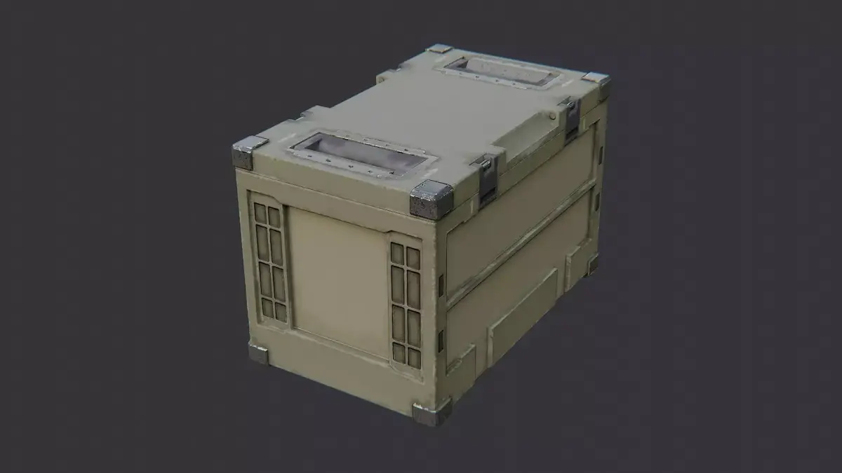 Olive military storage container with rugged panels and reinforced corners. This single-material crate offers realistic wear, subtle scratches, and clean UVs for easy texturing. Ideal for field camps, supply depots, or industrial environments in scenes and renders. Durable, portable, and versatile for props and background scenery.