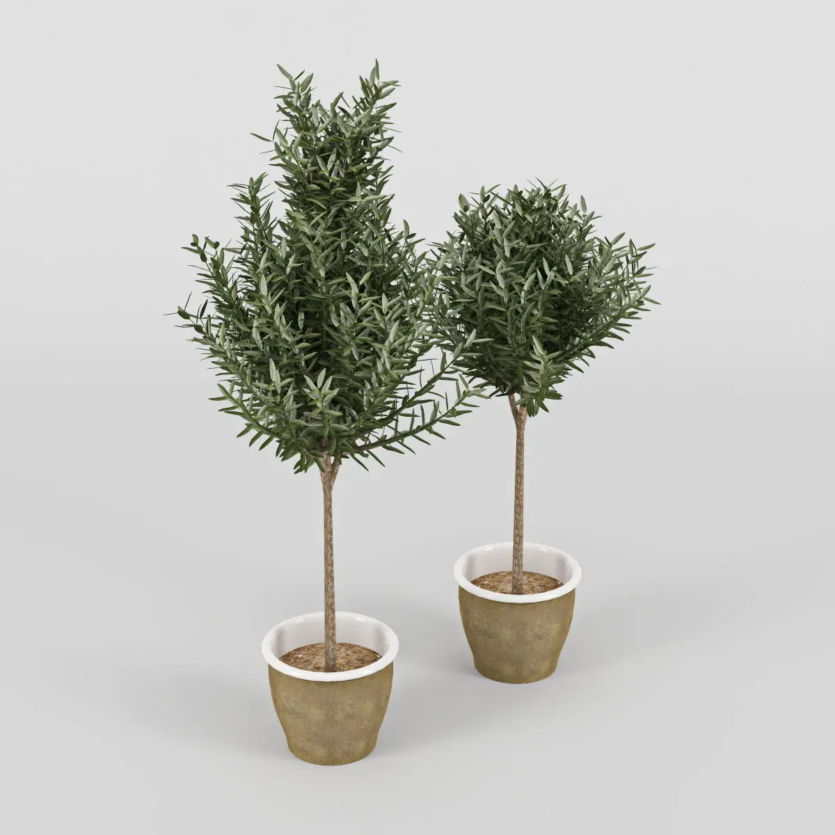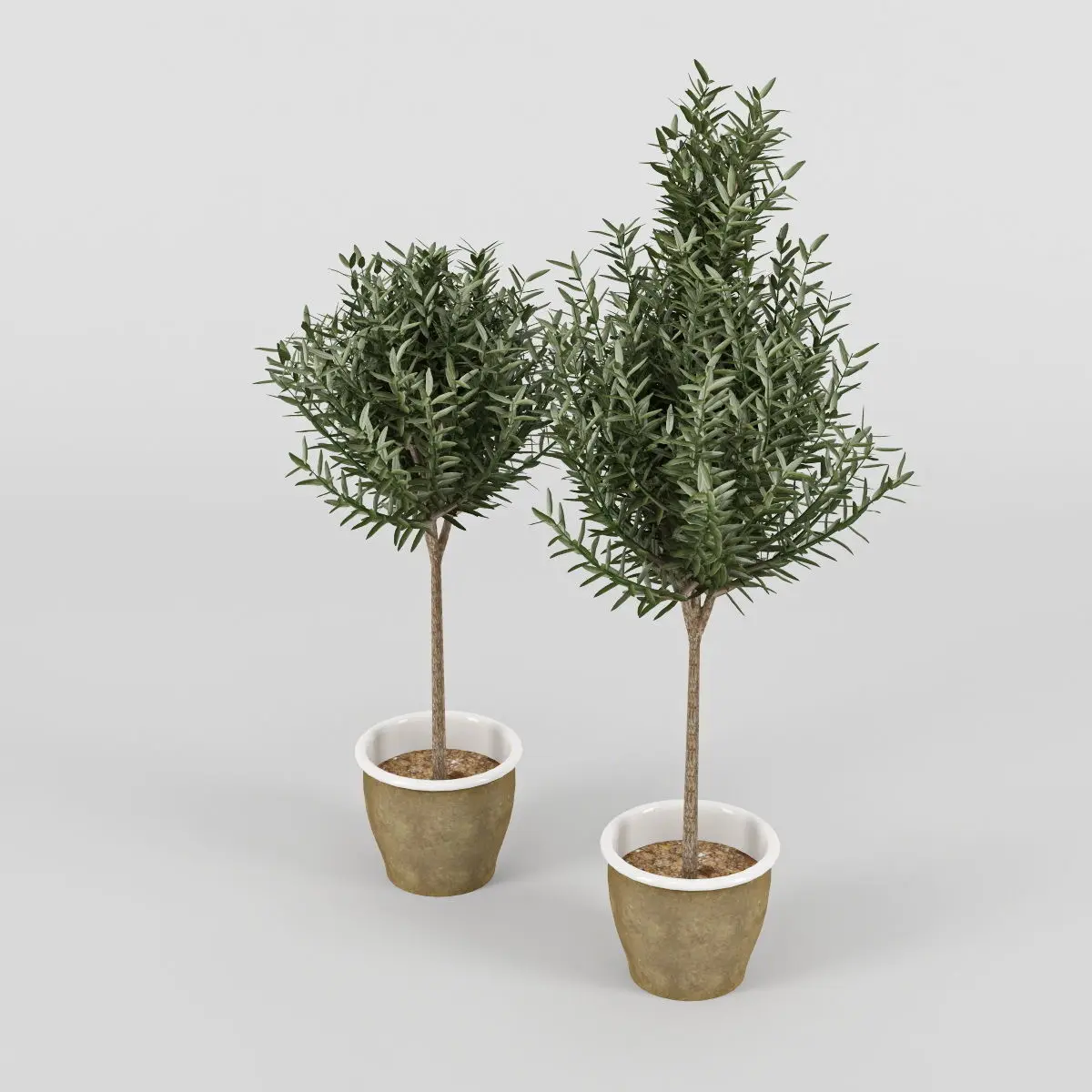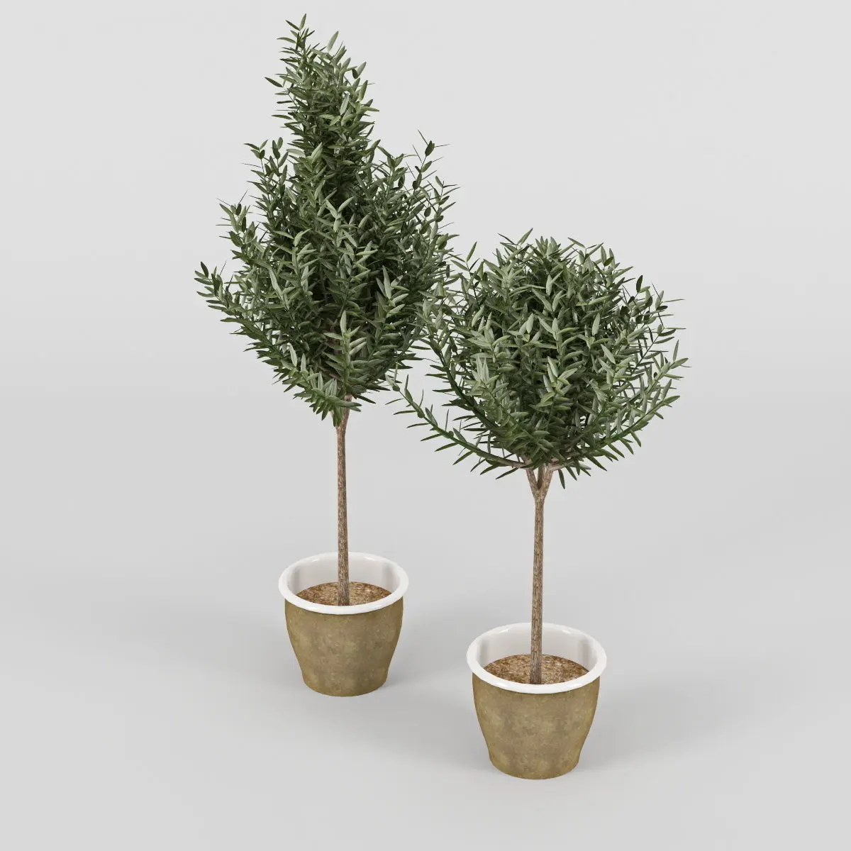 High-detailed model of two olive trees growing in pots.