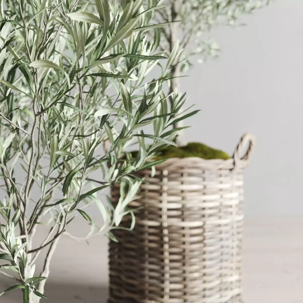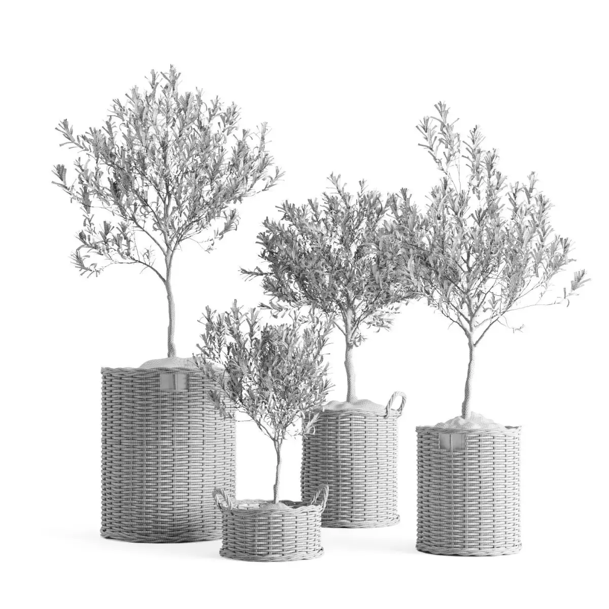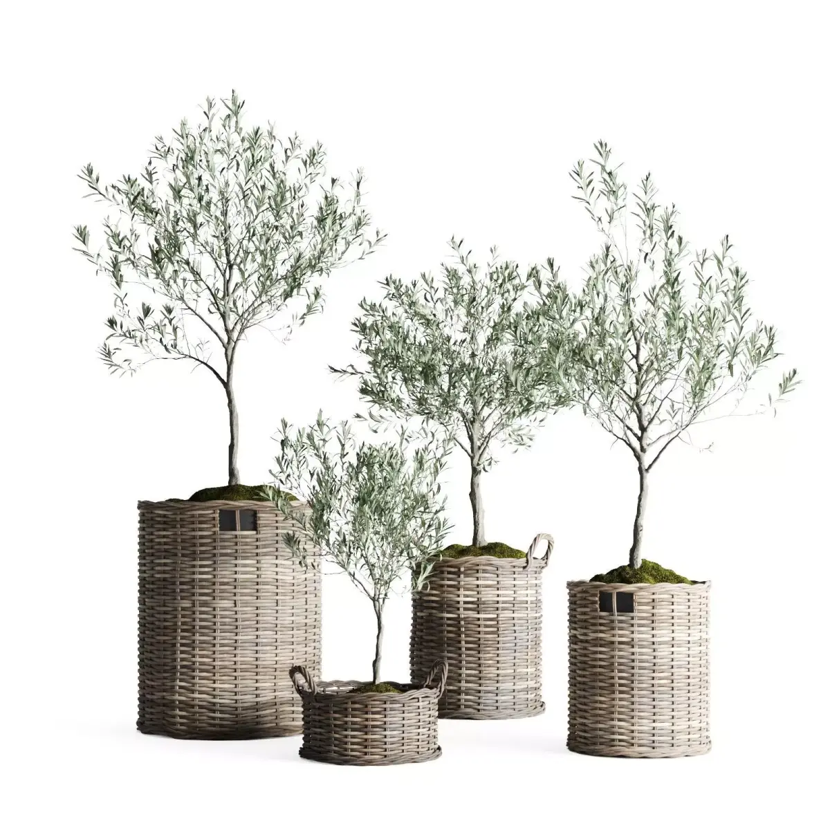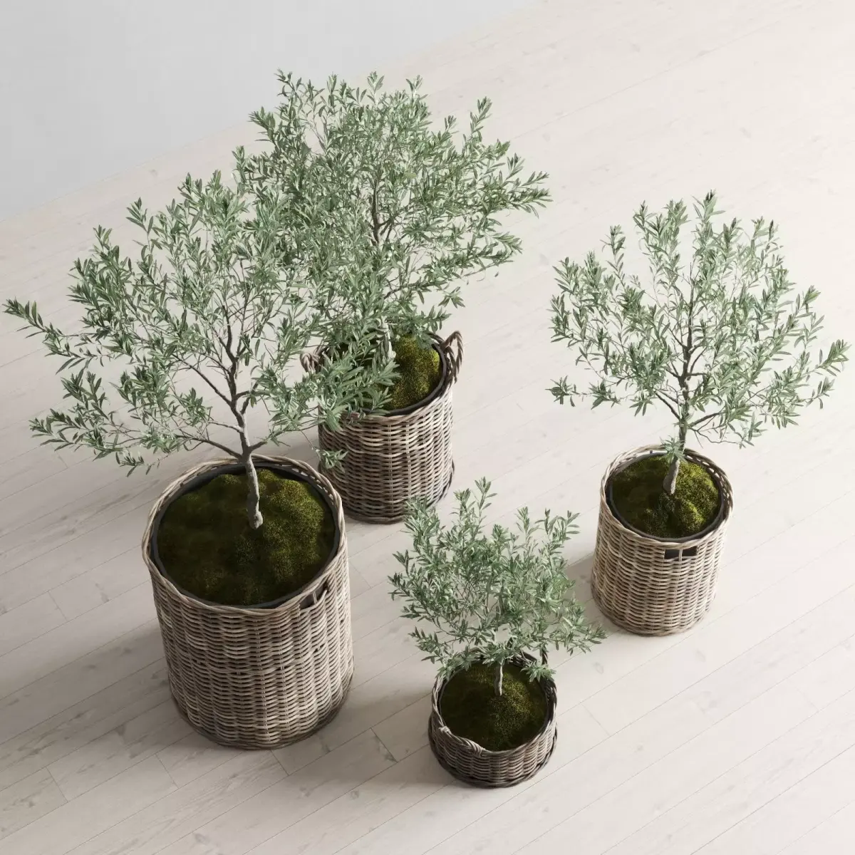 A realistic 3D set of four olive trees (Olea europaea, Olive Tree) placed in natural wicker baskets with decorative moss.Each tree has a unique shape and height, making the composition versatile for interior and exterior visualizations.The set follows a minimalistic Mediterranean aesthetic and perfectly fits modern, Scandinavian, and Japandi interiors.All materials are PBR-based with detailed wood, wicker, and foliage textures, optimized for high-quality renders.