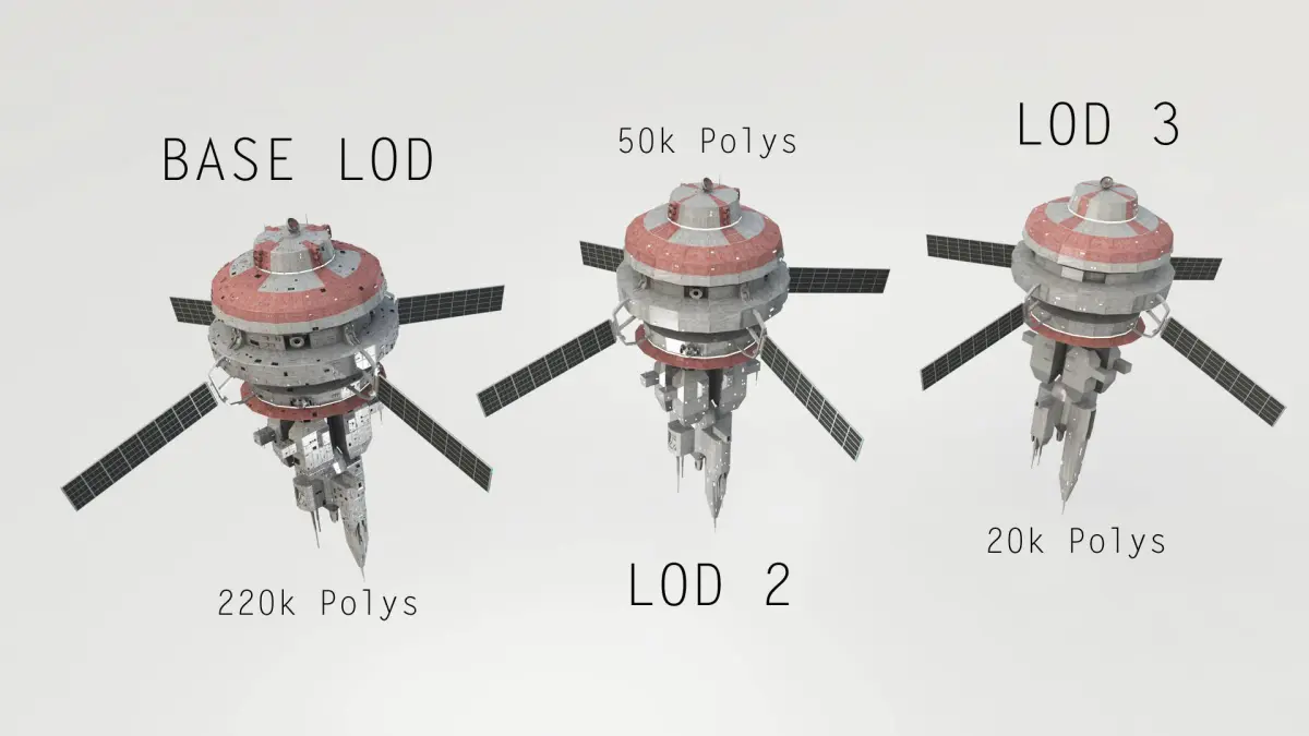 At just over 200,00 polys at Base level, this model is great for close up and can be used as a space station or land base/structure. The Station colors can be changed very easily to better suit your needs. LOD`s are in FBX and Obj. format for ease of use and implementation.