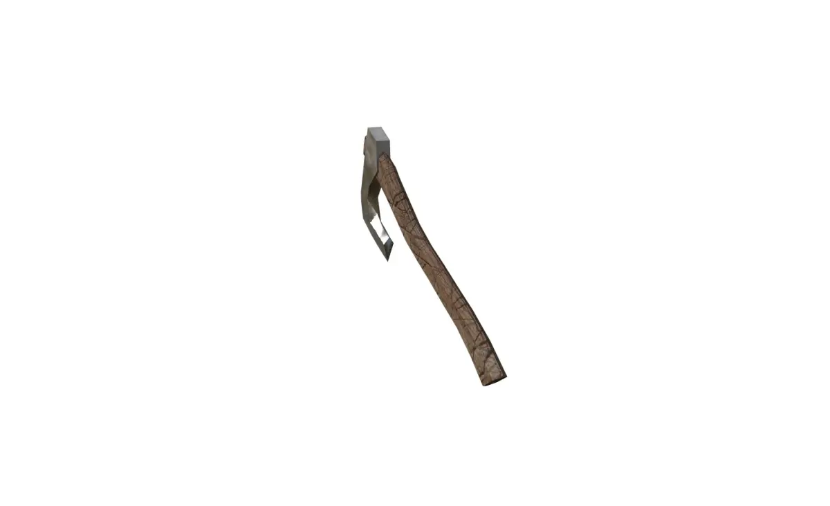 This low-poly 3D model represents a hand axe, designed with simplicity and optimization for use in video games, virtual environments, or simulations. The axe features a rugged, slightly worn metal blade with a distinct sharp edge and surface scratches, giving it a realistic, weathered look. The handle is crafted from a textured wooden material, showcasing natural grain patterns, adding to its authenticity. The wooden grip is reinforced with wrapping, enhancing the model's detail while maintaining a lightweight polygon structure.