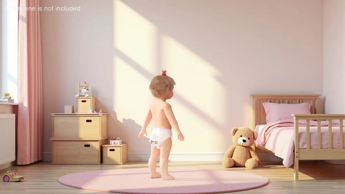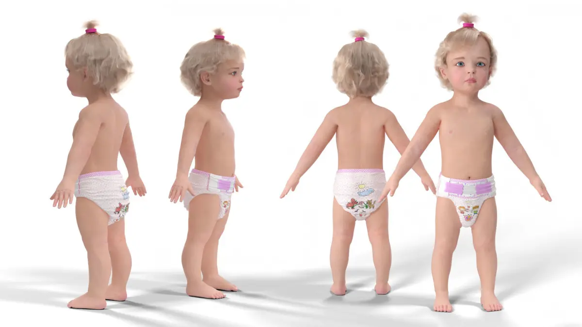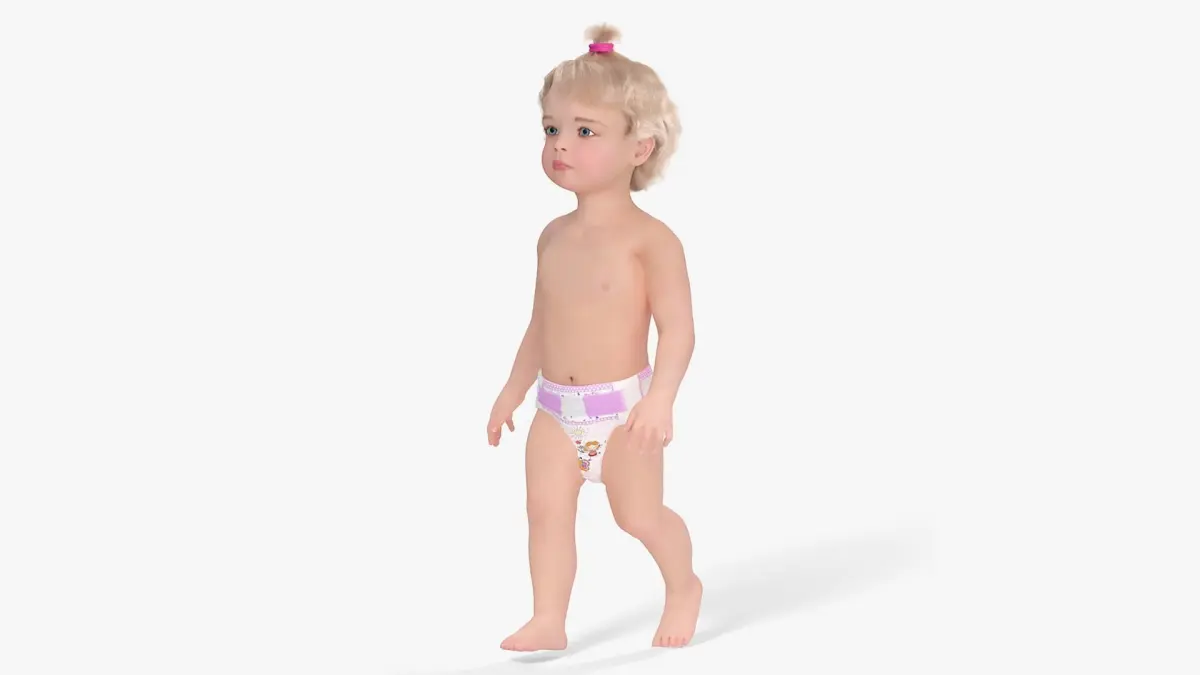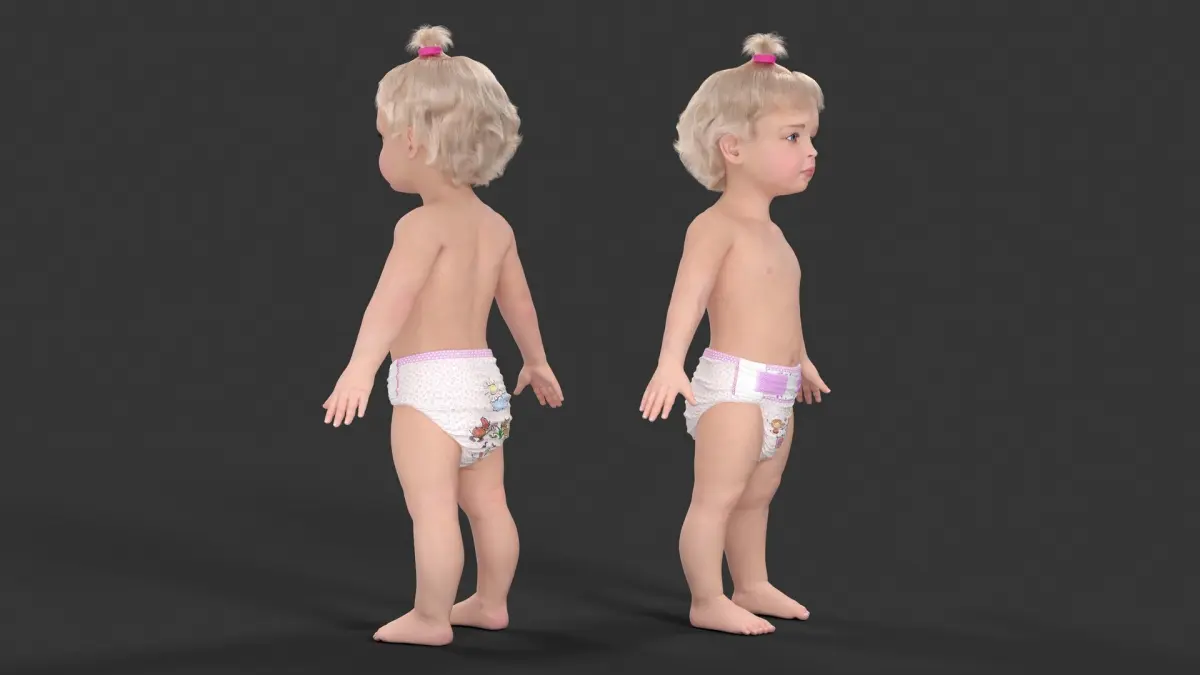 One Year Old Girl in Diaper Fur Rigged is a 3d model of a cute one-year-old girl character, designed for animation and interactive applications, dressed in a diaper.