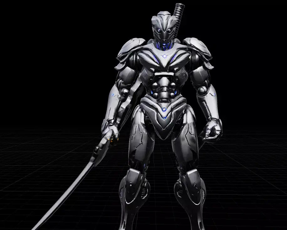 The Cybernetic Shinobi is a premium, high-fidelity 3D model designed for futuristic combat settings. Featuring a sleek, obsidian-colored armor plating with bioluminescent blue accents, this model captures the perfect blend of traditional samurai aesthetics and advanced mecha technology.