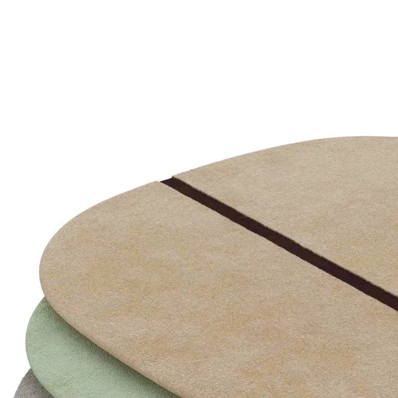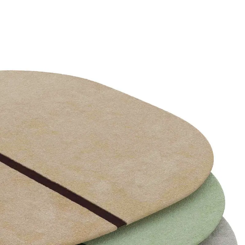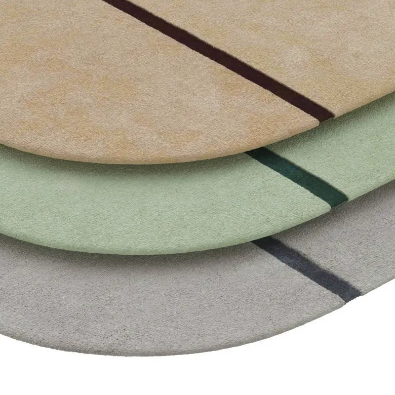 The Oona rugs are characterized by clean lines and soft curves that meet and create three unique shapes that are neither round nor square. The sober color of the carpets is interrupted by a simple line immersed in a darker color. The Oona rug is available in three sizes and colors; pink, mint and gray. The carpets can be placed in any environment and used for many purposes. For example, in the dining room, under the coffee table, next to the bed or combined for use in a hallway or in a large hall.