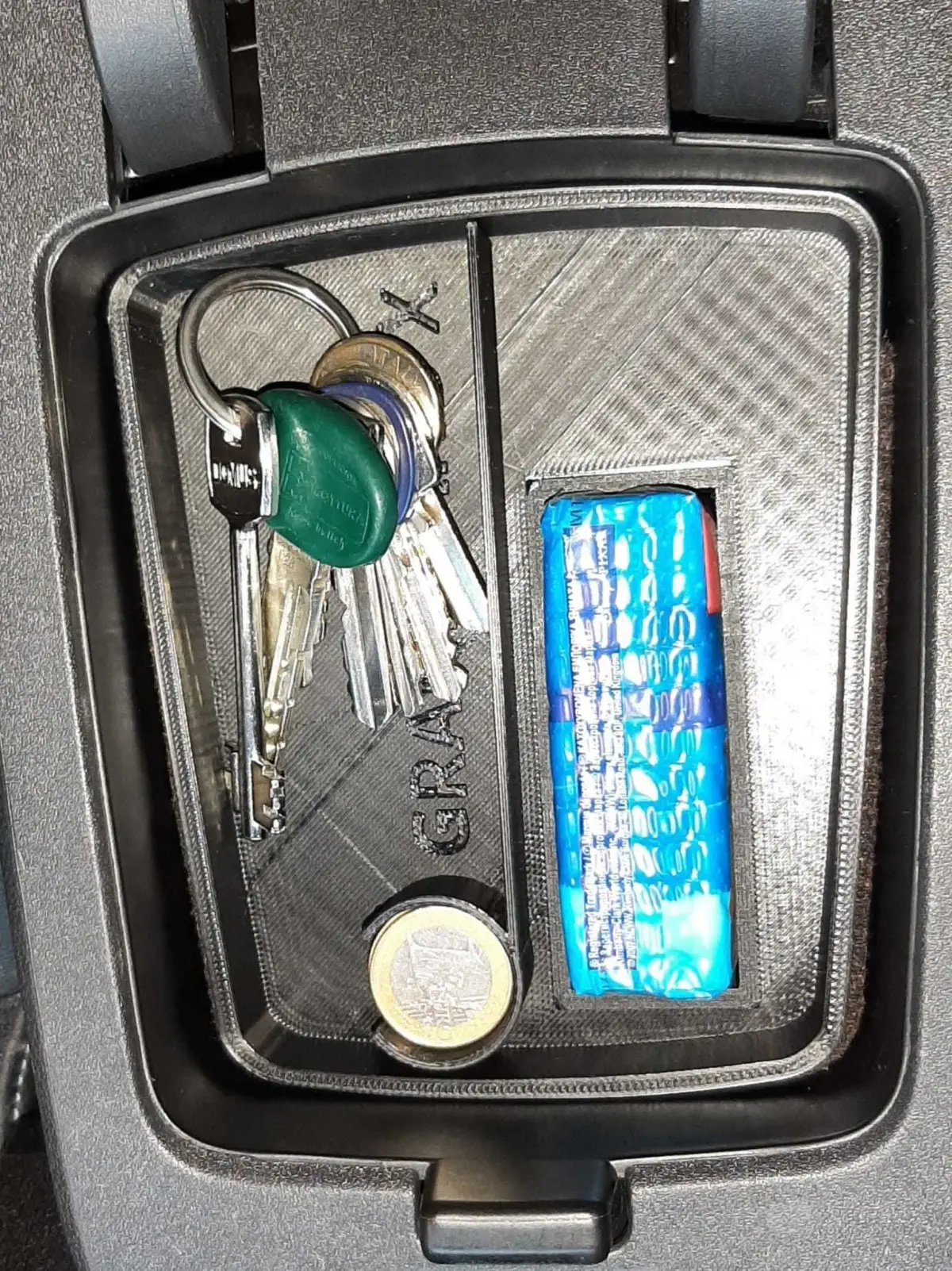 ENG:Storage tray for the armrest of the Opel / Vauxall Grandland X (all versions). The purchase includes: Tub, Pocket housing cover cap and 50mm pocket.The tub has a 20mm edge and a 30x80mm opening to introduce objects into the compartment under the armrest which can be closed with the cap.Compared to the edge of the armrest, the tub is about 40mm lower, so it can easily contain even larger objects, has a euro-holder area and two object-holder areas.It can be printed in PLA or ABS with 5% or 10% max infill. If necessary, to avoid creaking, a felt pad with a thickness of 1-1.5mm can be added laterally